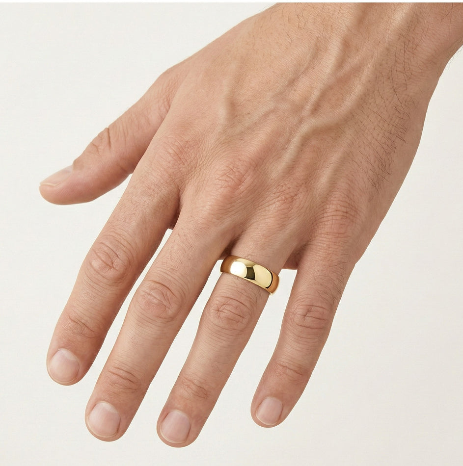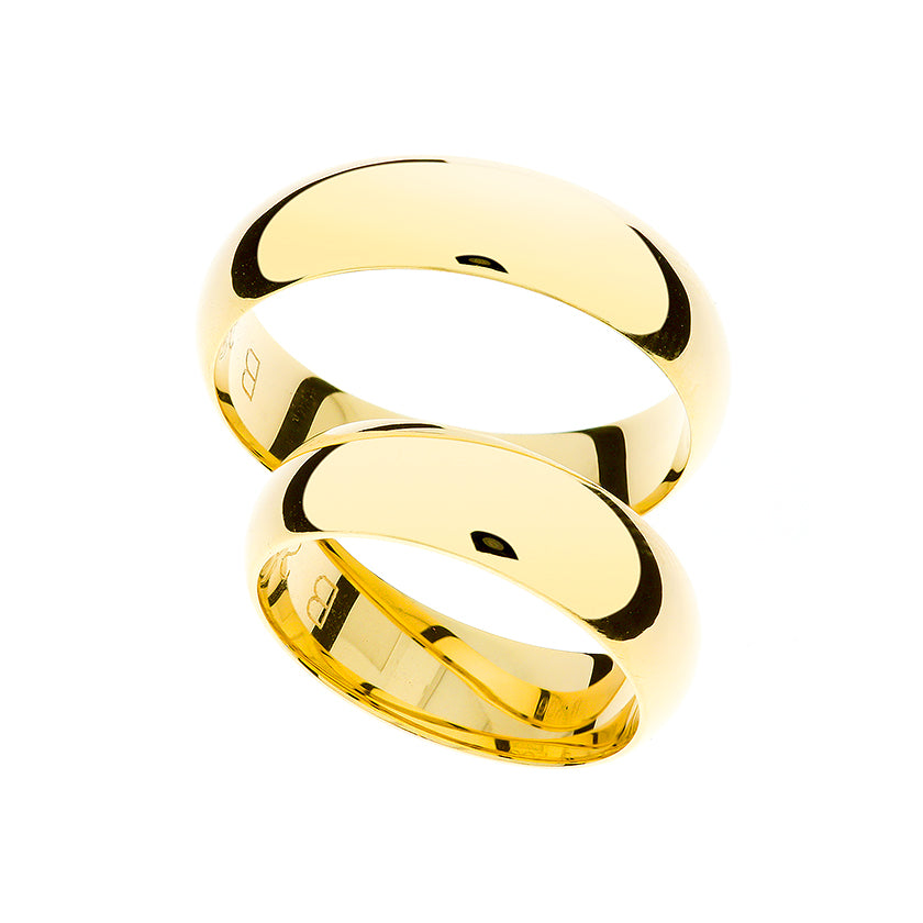 Nadčasové a elegantní snubní prsteny pro muže a ženy ze 14kt žlutého zlata. Tyto prsteny mají vysoce leštěný povrch a klasický design se zaoblenými stranami. S 6 mm šířkou nabízejí rafinovaný vzhled ideální pro každý pár.