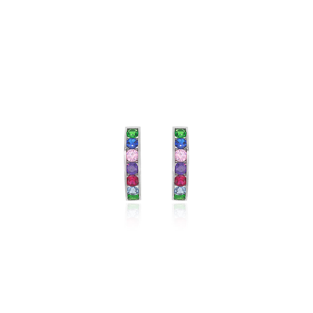 Elegantní dámské náušnice z bílého 14kt zlata zdobené ametystem, kubickými zirkony, růženínem a syntetickým rubínem, smaragdem a safírem v kulatém jemném stupňovitém výbrusu. Tyto náušnice, které mají puzetové zasazení a bezpečné objímkové zapínání, jsou živým a univerzálním doplňkem pro každou příležitost.
