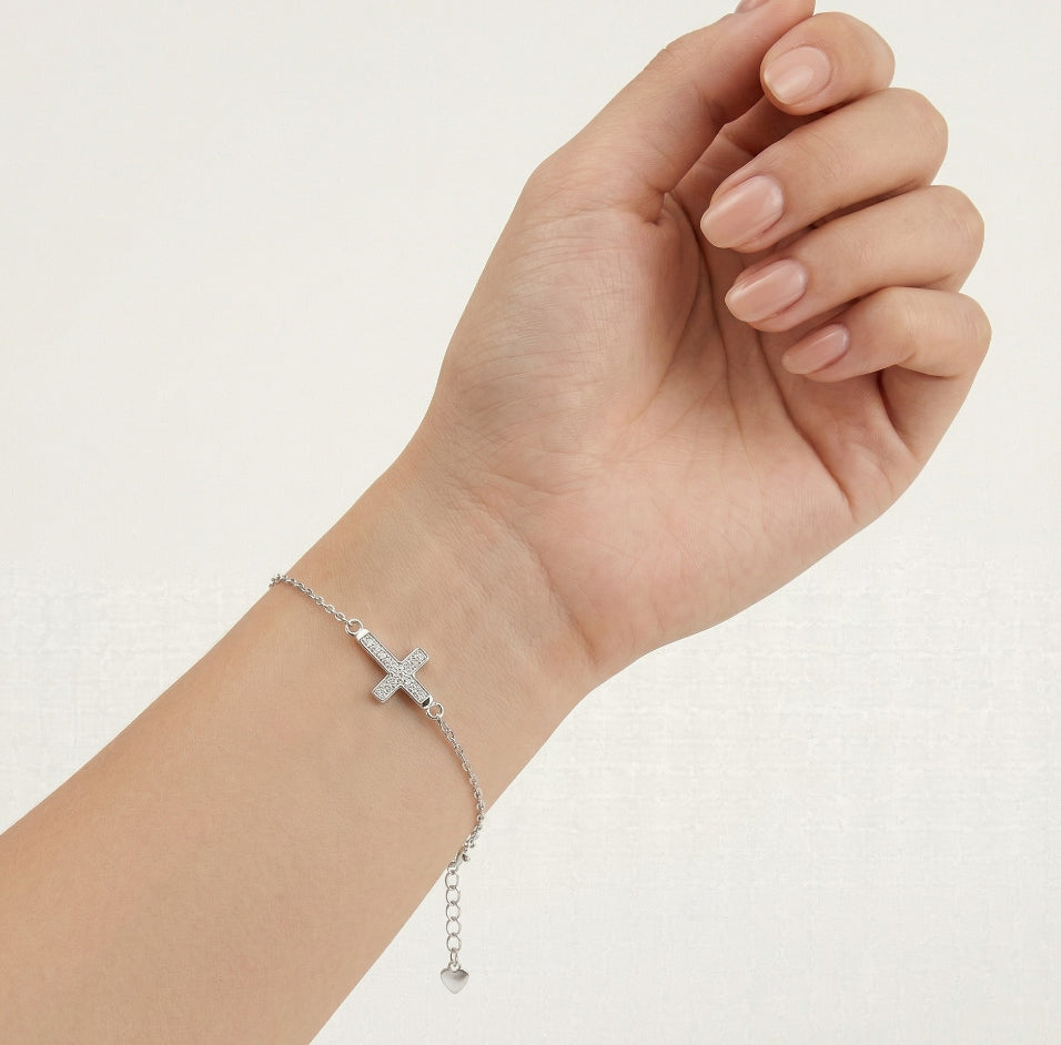 Dodejte našemu stříbrnému náramku nádech víry a elegance díky kulatým jemným zirkonům ve stupňovitém výbrusu, bezpečně zasazeným do zářezu. Náramek je zakončen pružinovým kroužkovým zapínáním a krásným přívěskem kříže.