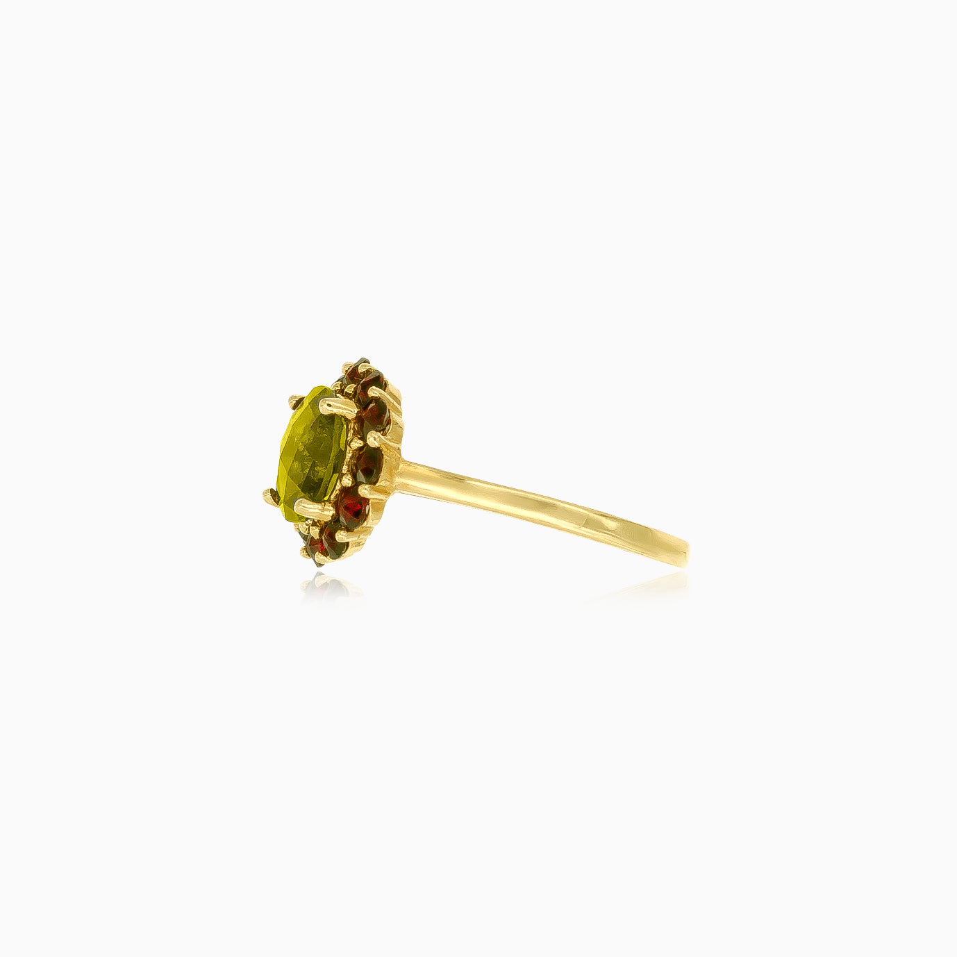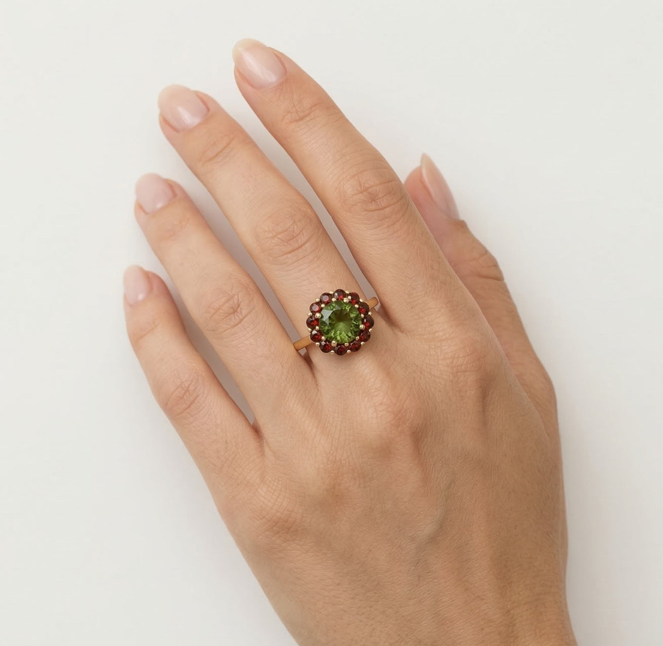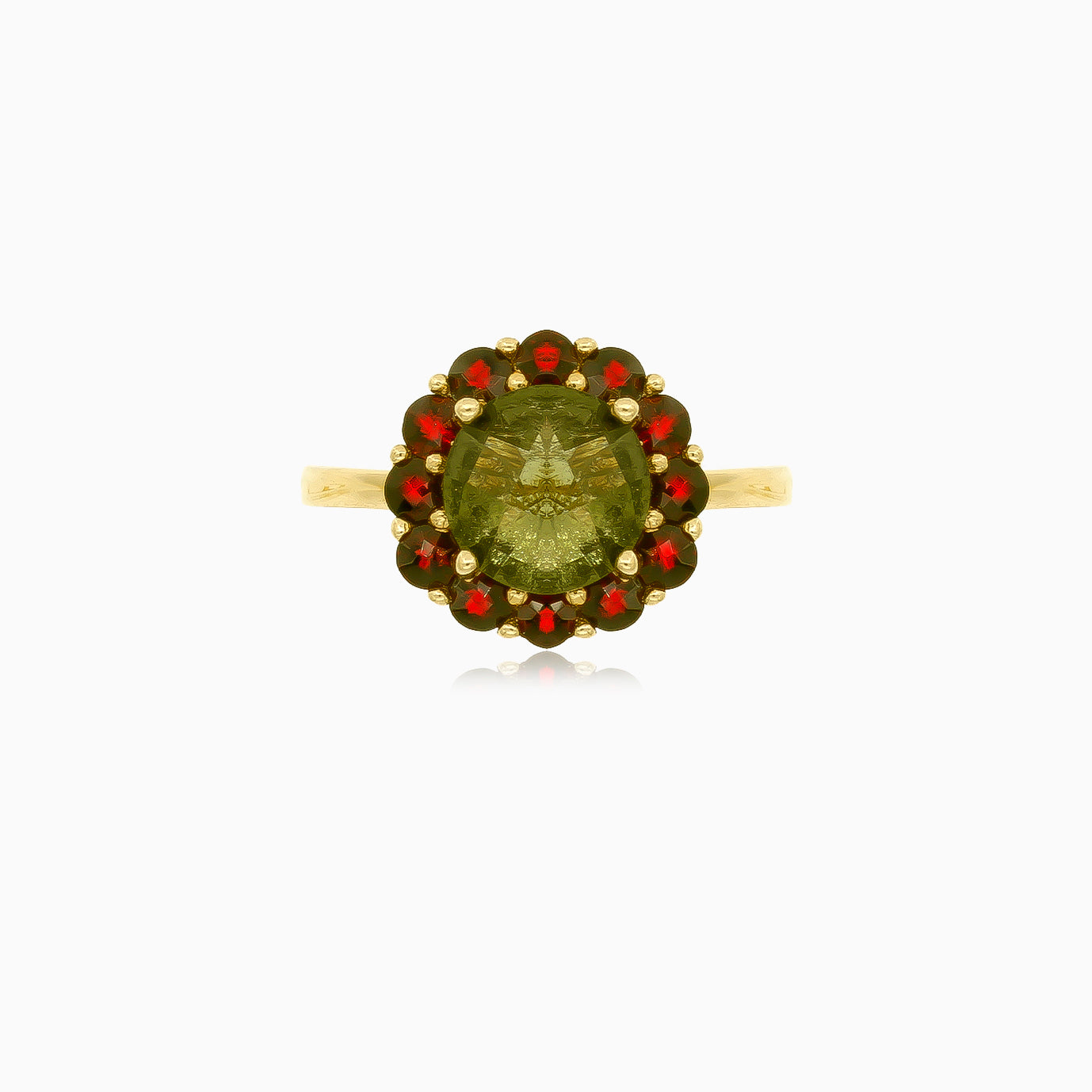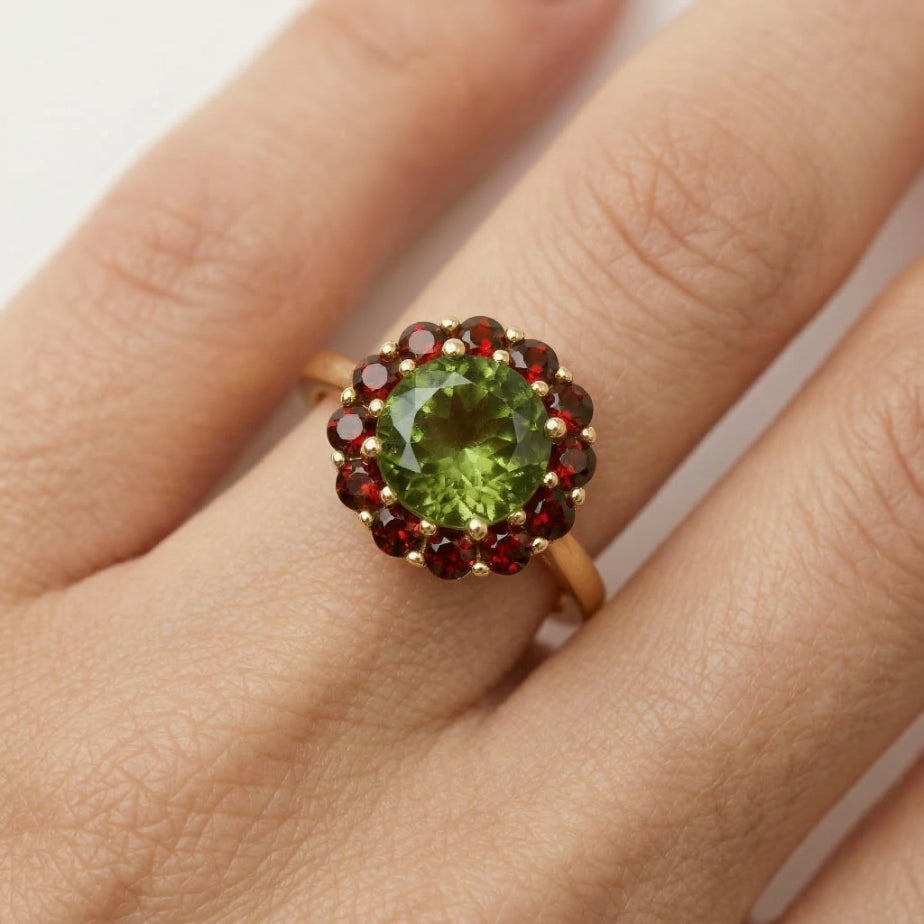 Ozdobte se tímto nádherným dámským prstenem s kulatým jemným stupňovitě broušeným moldavitem a granátem zasazeným ve 14kt žlutém zlatě. Společné zasazení umocňuje královský půvab a činí z něj květinové mistrovské dílo.