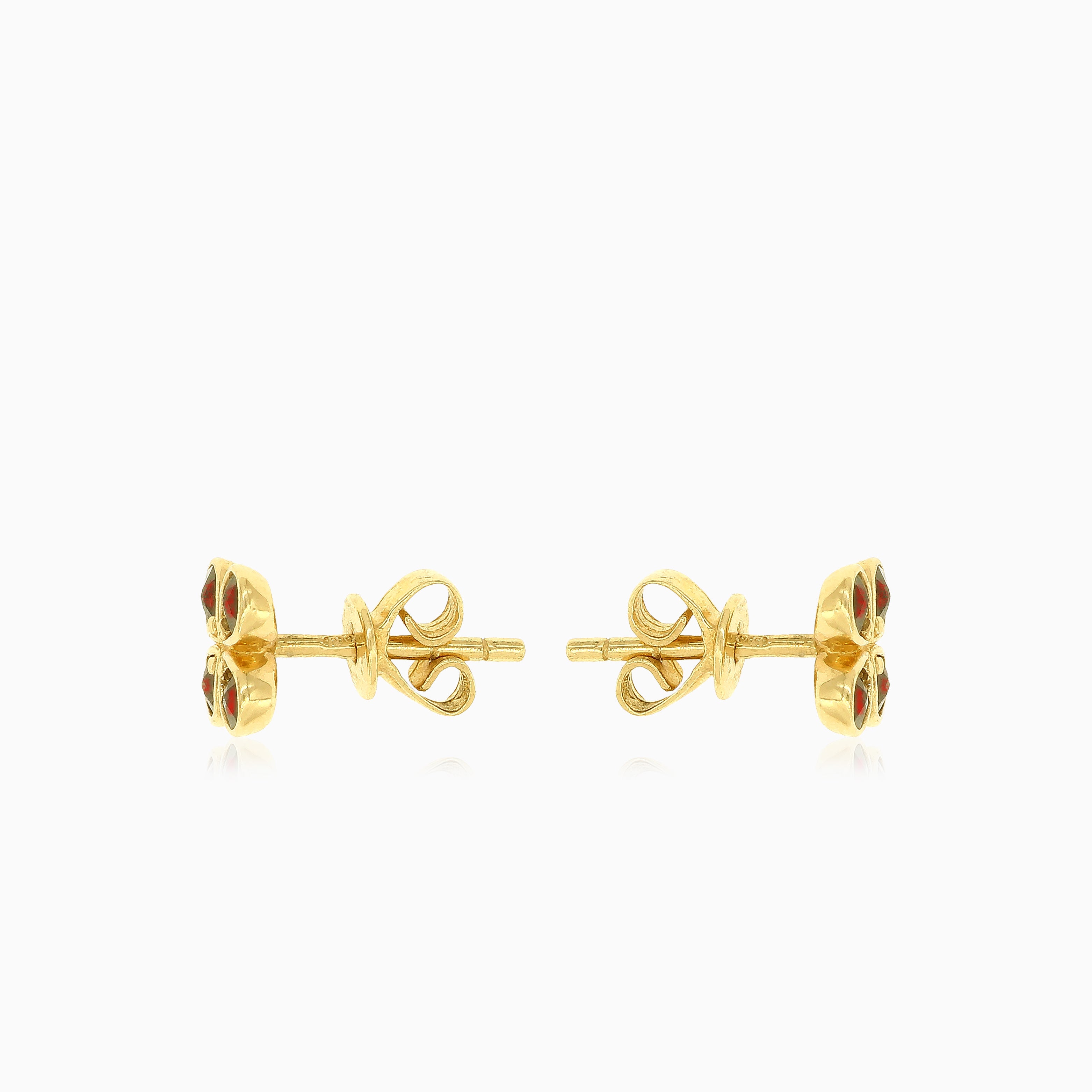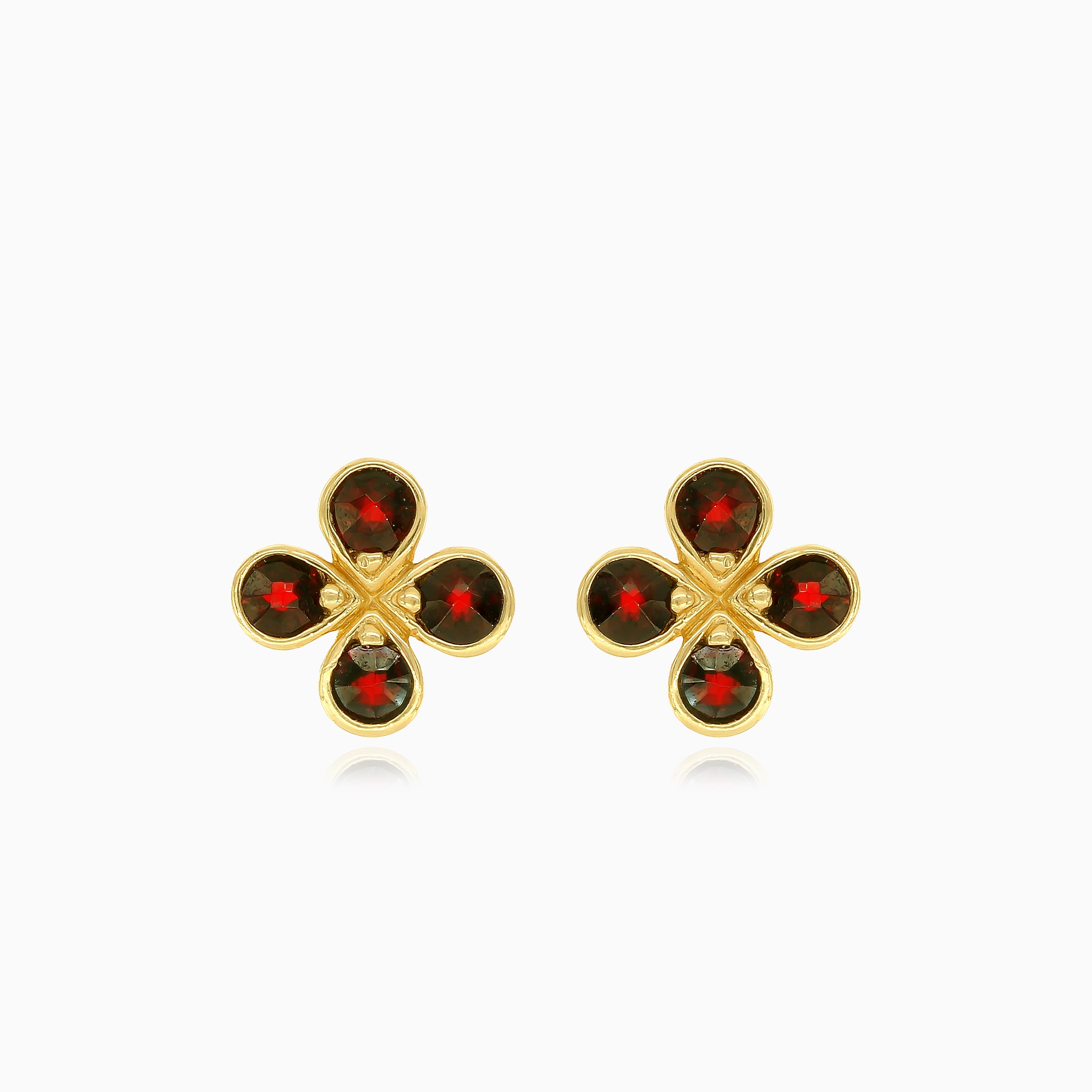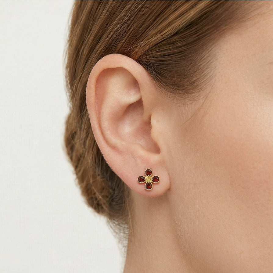 Dodejte eleganci našim granátovým náušnicím. Tyto nádherné náušnice s kulatými jemnými stupňovitě broušenými granáty v klasickém zasazení jsou vyrobeny ze 14kt žlutého zlata s bezpečným puzetovým zapínáním.