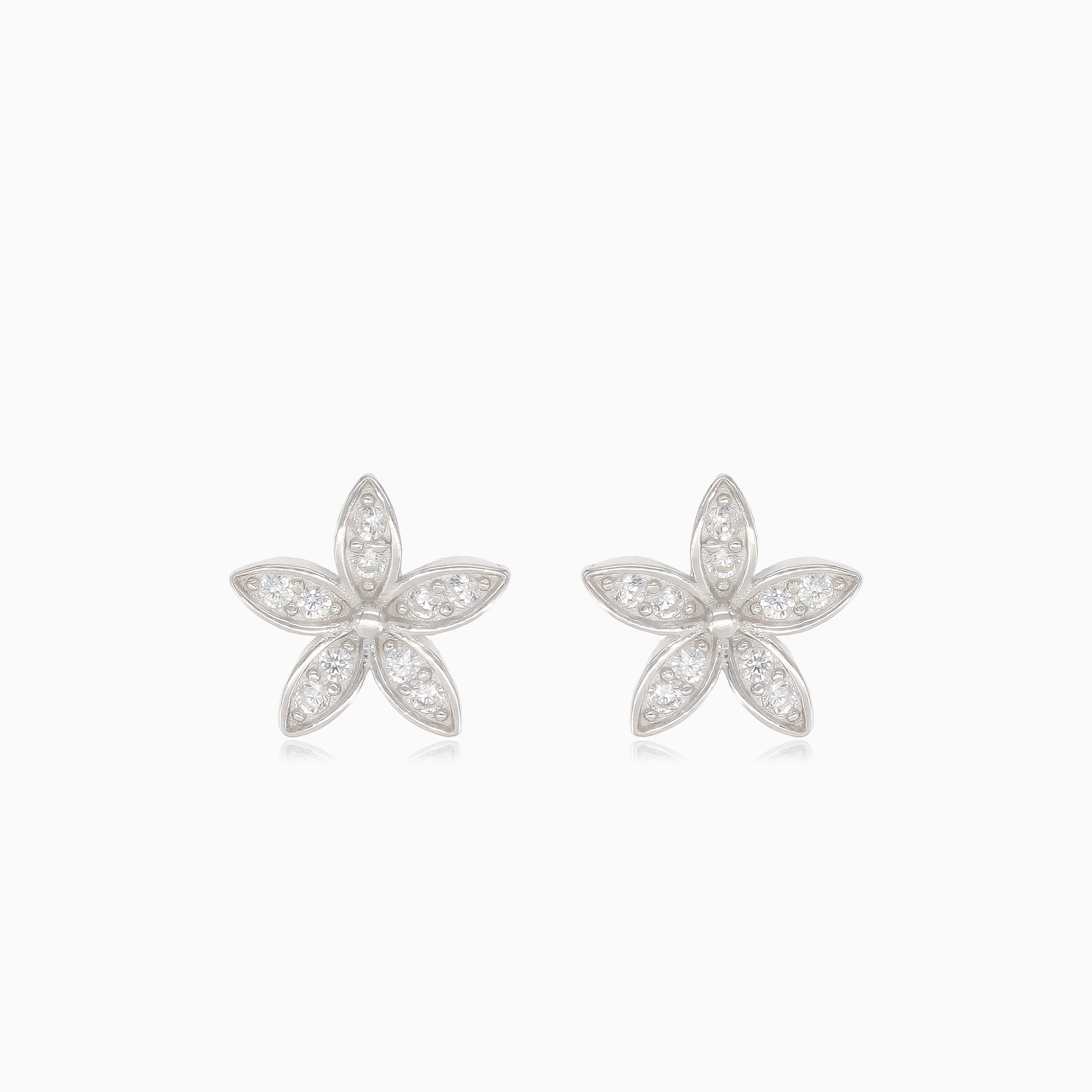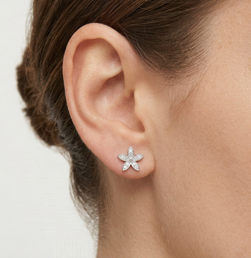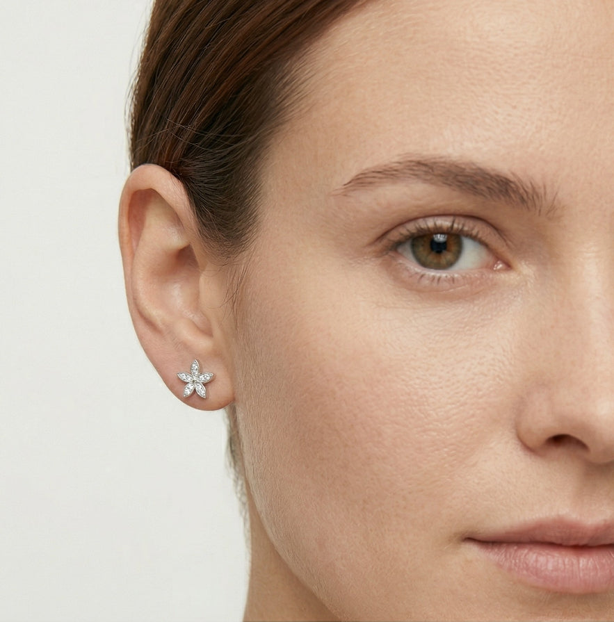 Objevte sofistikovanost s našimi stříbrnými náušnicemi ve tvaru květiny zdobenými vsazenými kubickými zirkony, které vyzařují nadčasovou eleganci a šarm.