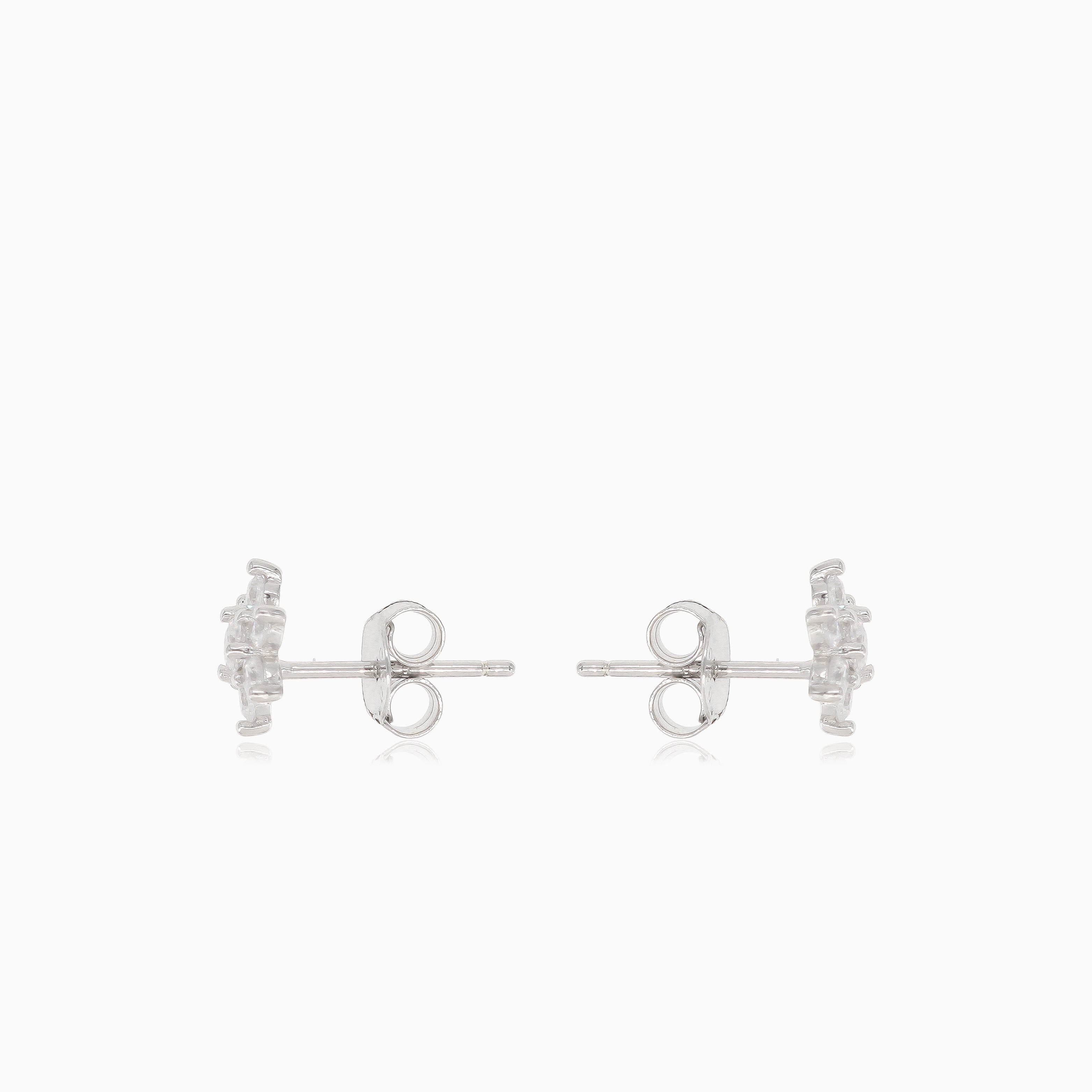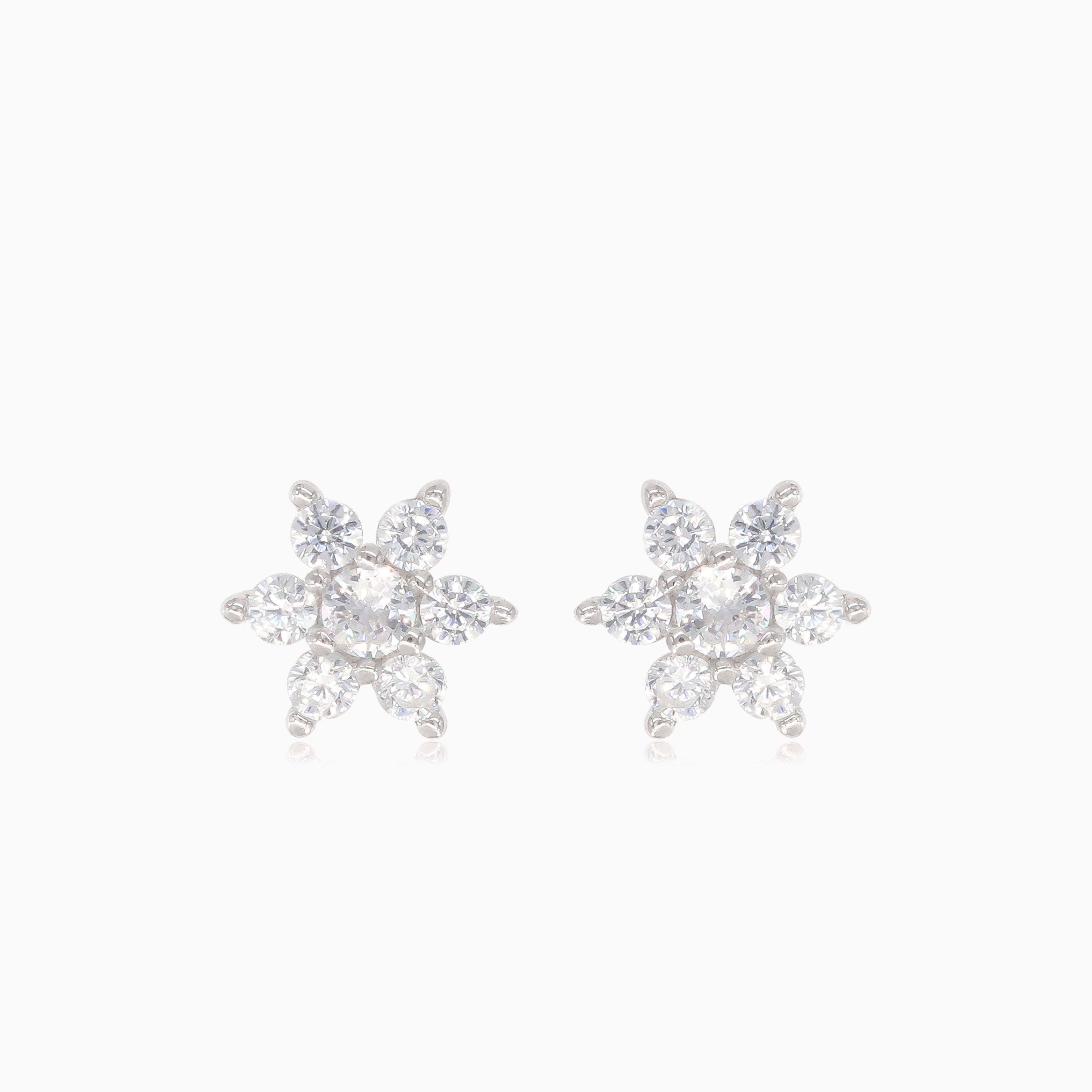 Jemné stříbrné náušnice s důmyslně zpracovanými květy z kulatých zirkonů, které vyzařují eleganci a šarm.