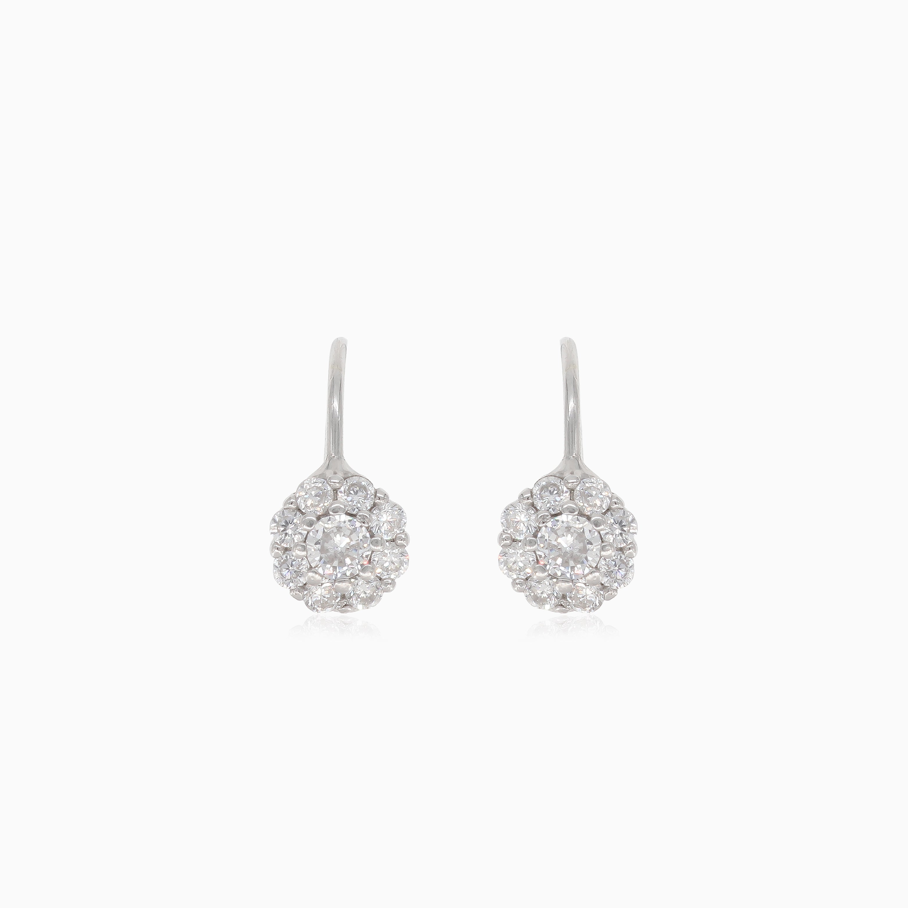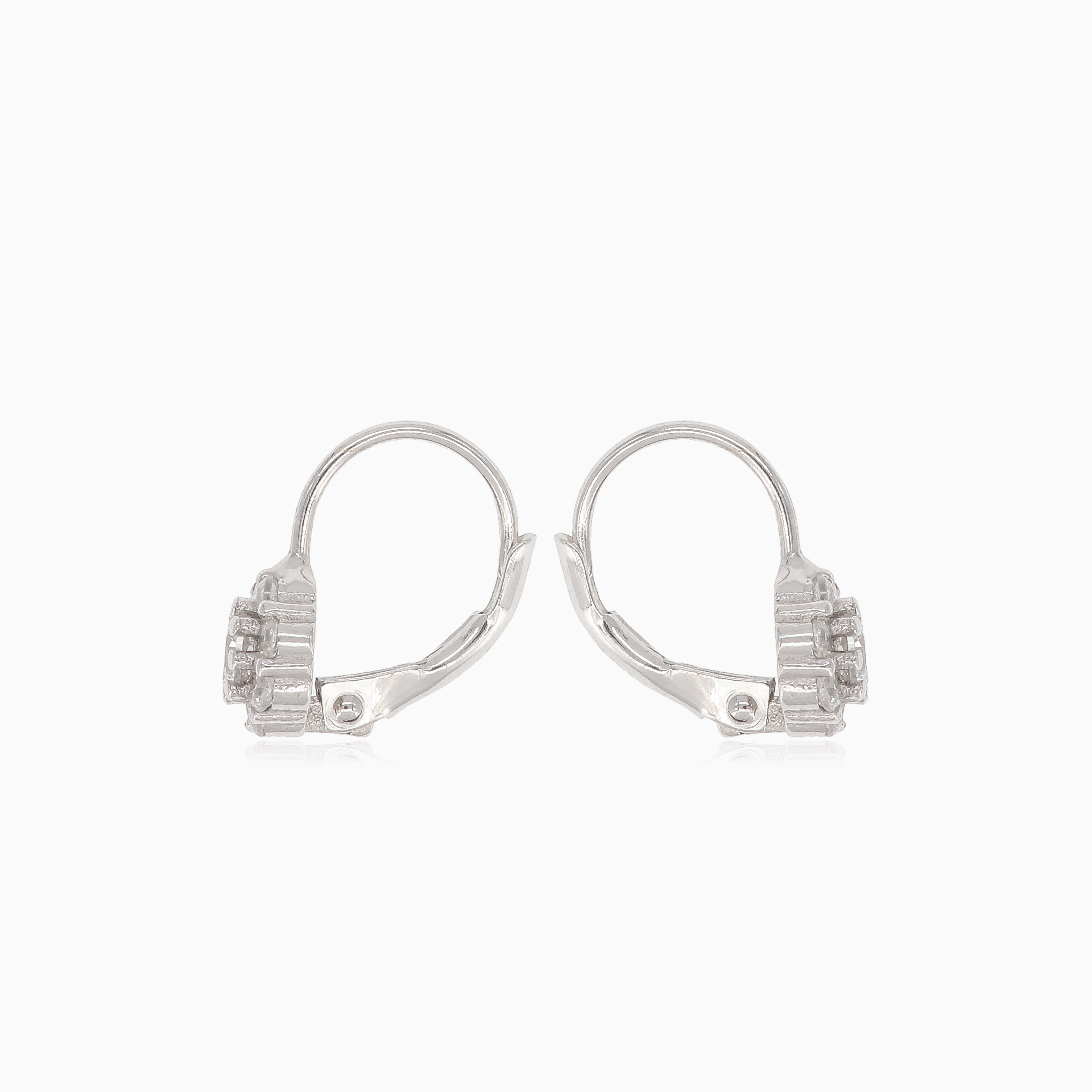 Ozdobte své uši těmito okouzlujícími stříbrnými náušnicemi s kulatým květinovým vzorem zdobeným třpytivými zirkony, doplněnými páčkovým zapínáním pro bezpečné nošení.