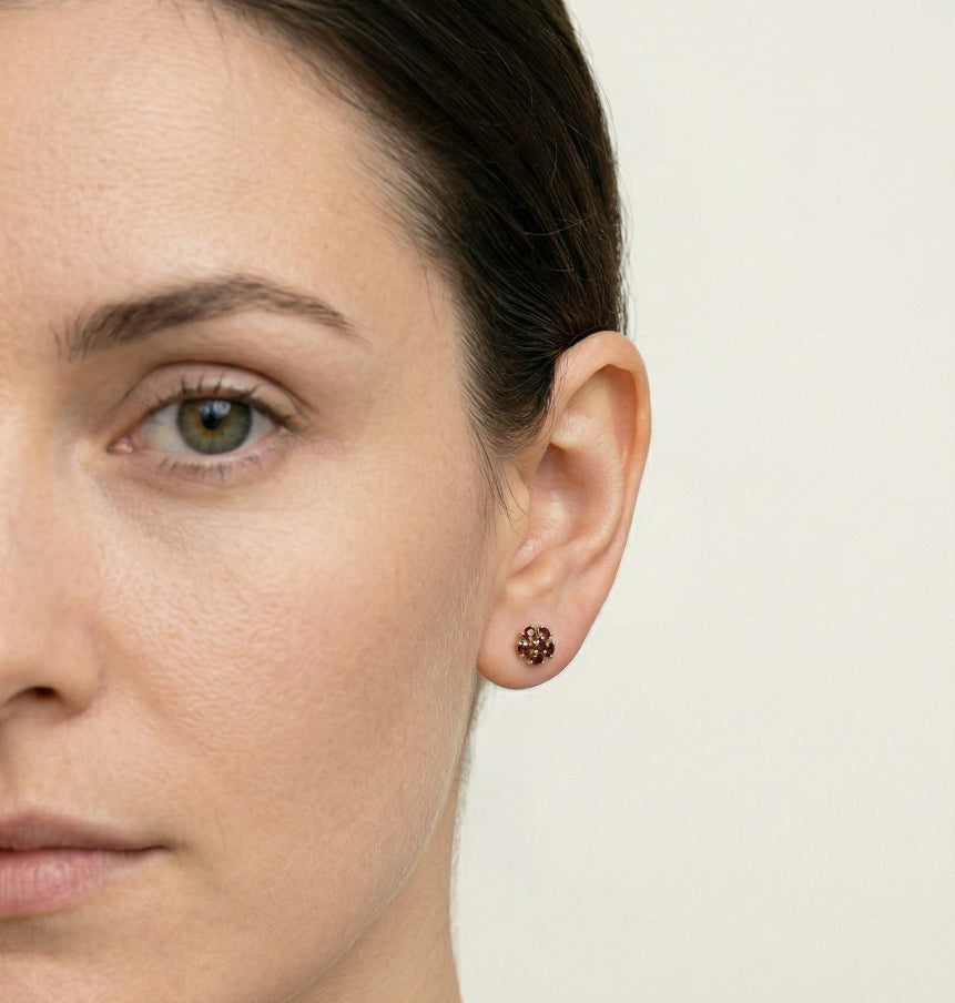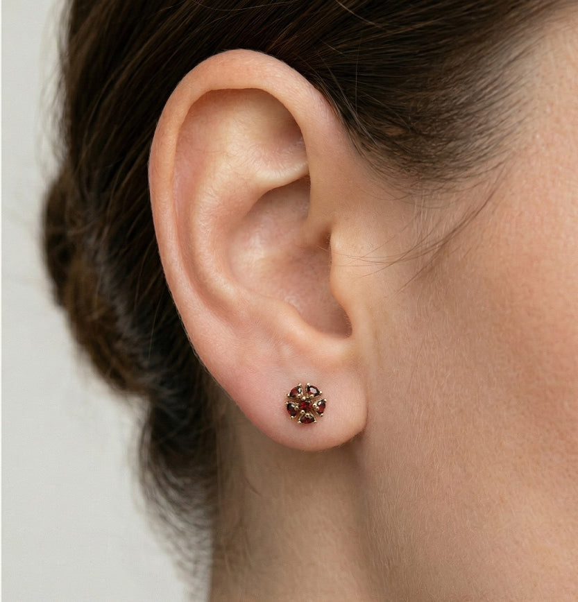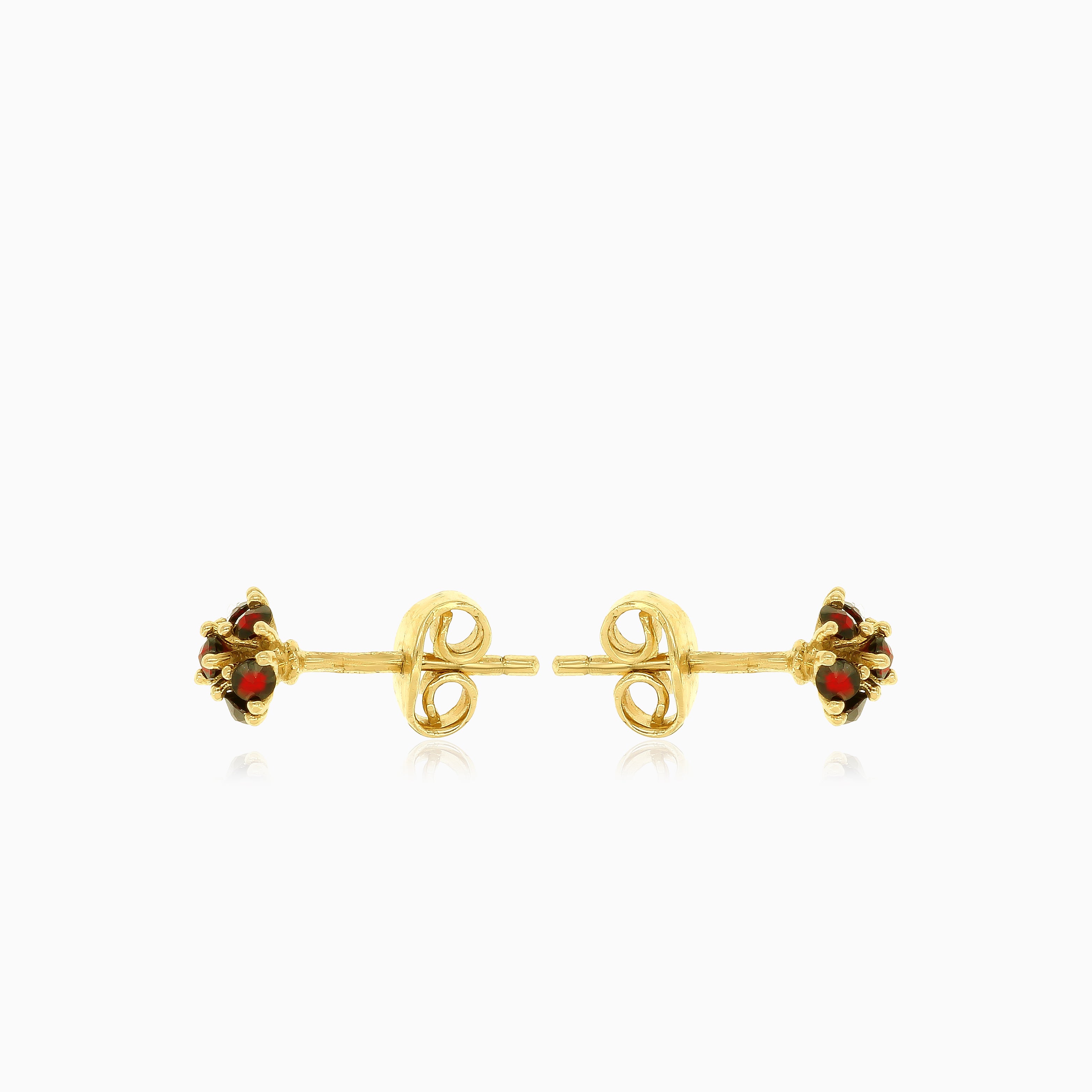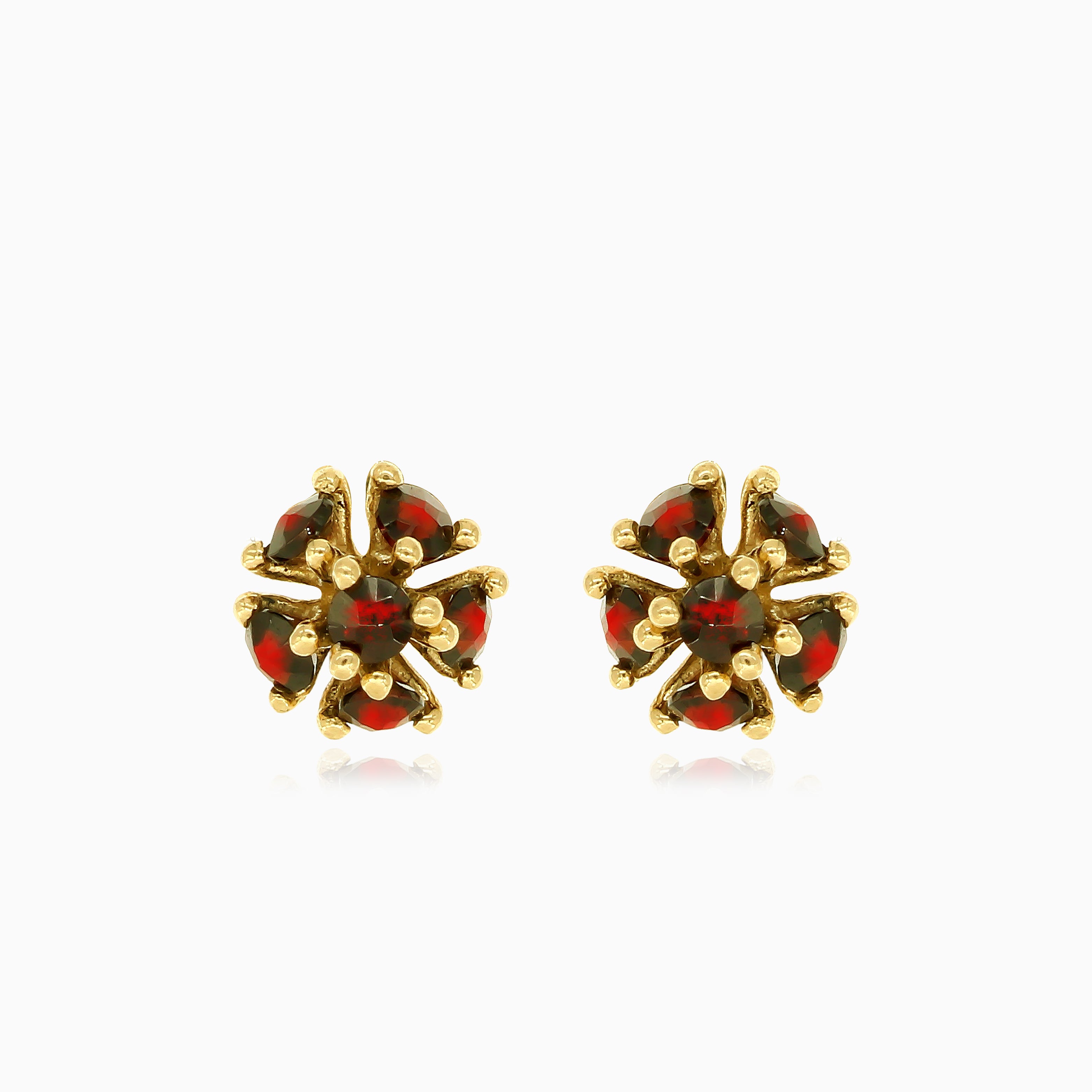 Objevte tyto stylové náušnice s kulatými granáty s jemným stupňovitým výbrusem, zasazené ve 14kt žlutém zlatě s klasickým zasazením. Elegantní design je doplněn stylovým motivem květiny, zajištěným puzetovým zapínáním.