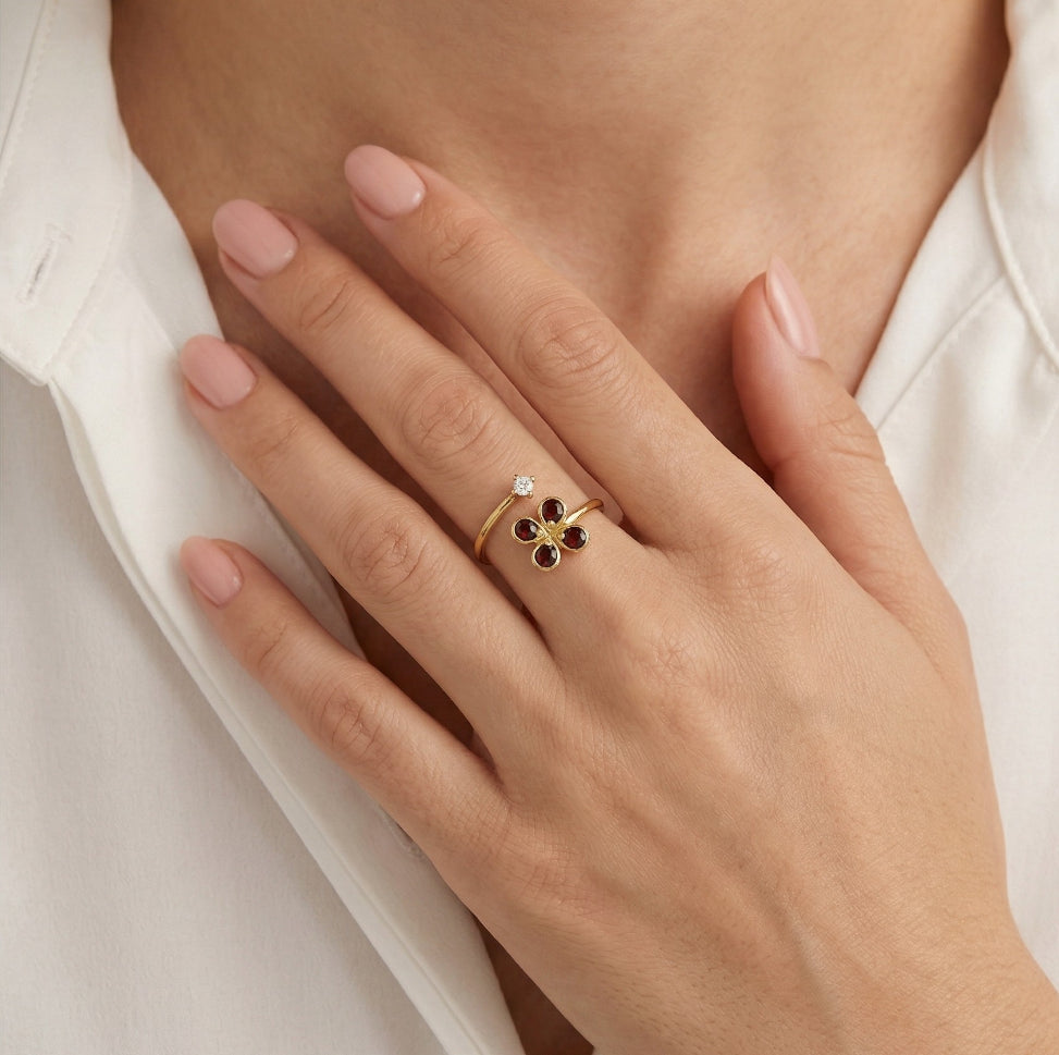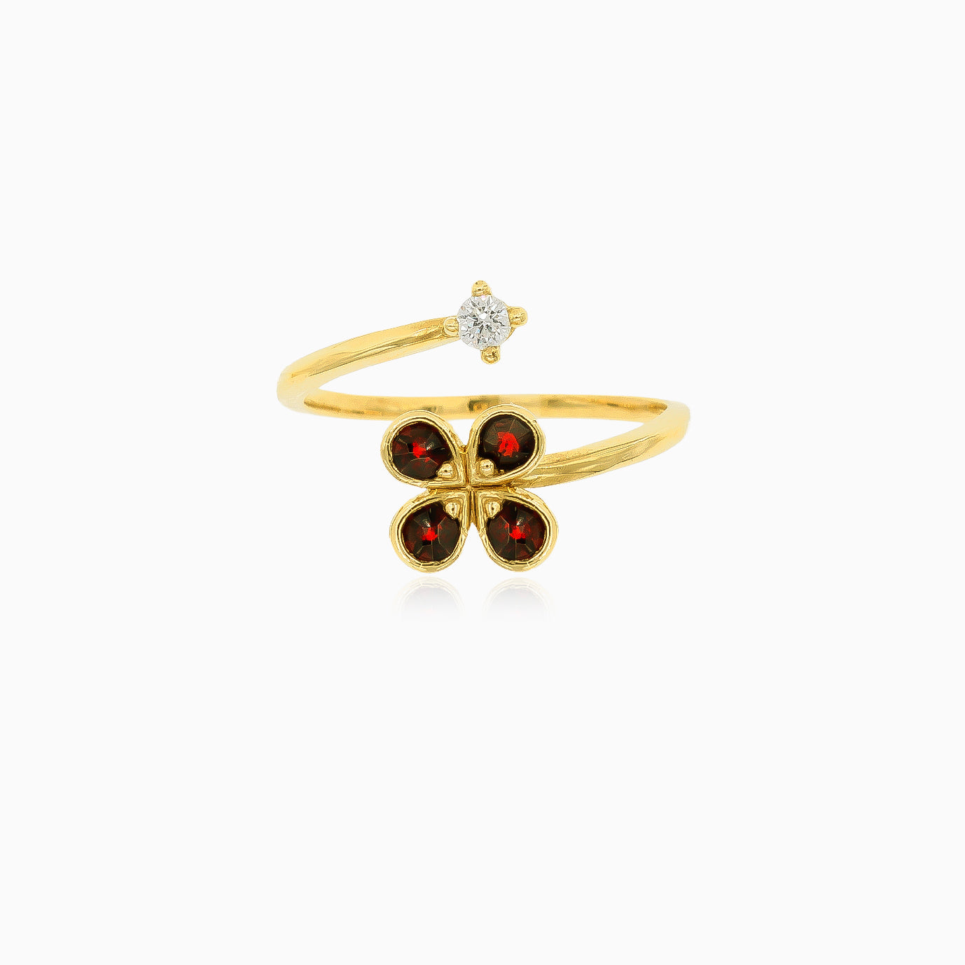 Zlatý nedokončený prsten s květinovým vzorem z granátů