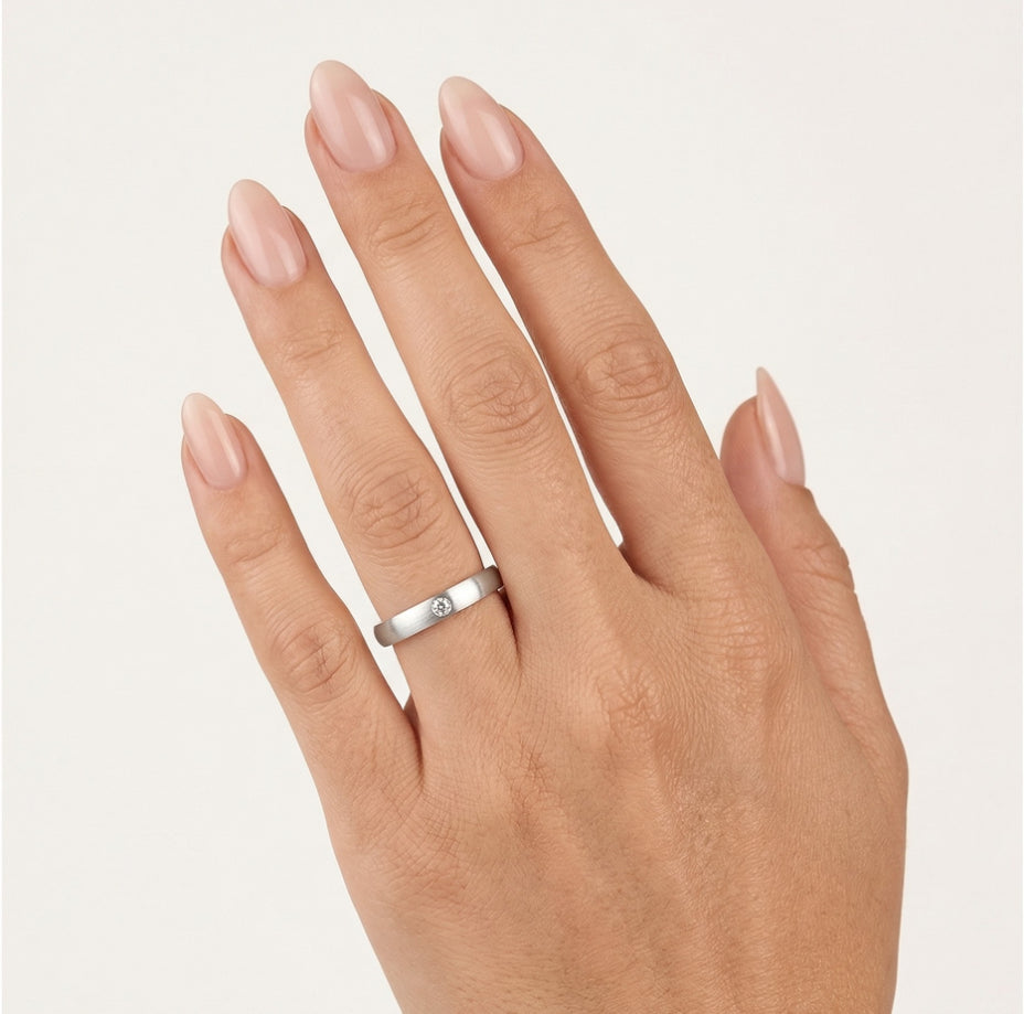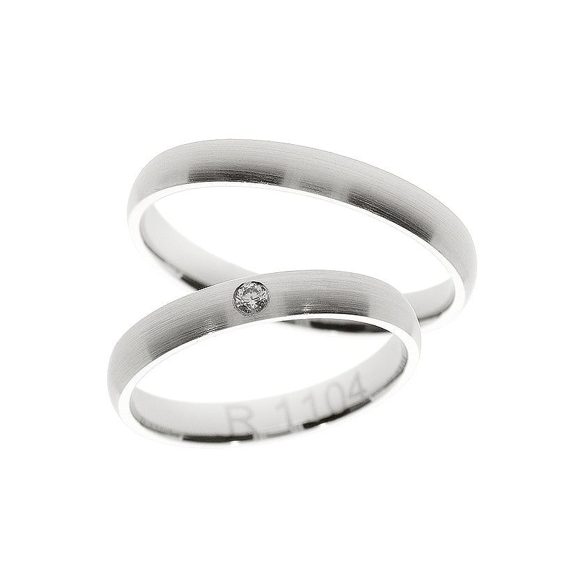 Tento snubní prsten z bílého 14kt zlata má sofistikovanou matnou povrchovou úpravu a je ideální volbou pro ženy i muže. Prsten o tloušťce 4 mm lze nosit hladký nebo vylepšený volitelným kubickým zirkonem nebo diamantem (0,12ct) v rámečku. Kulatý jemný stupňovitě broušený drahokam dodává tomuto modernímu designu nádech elegance.