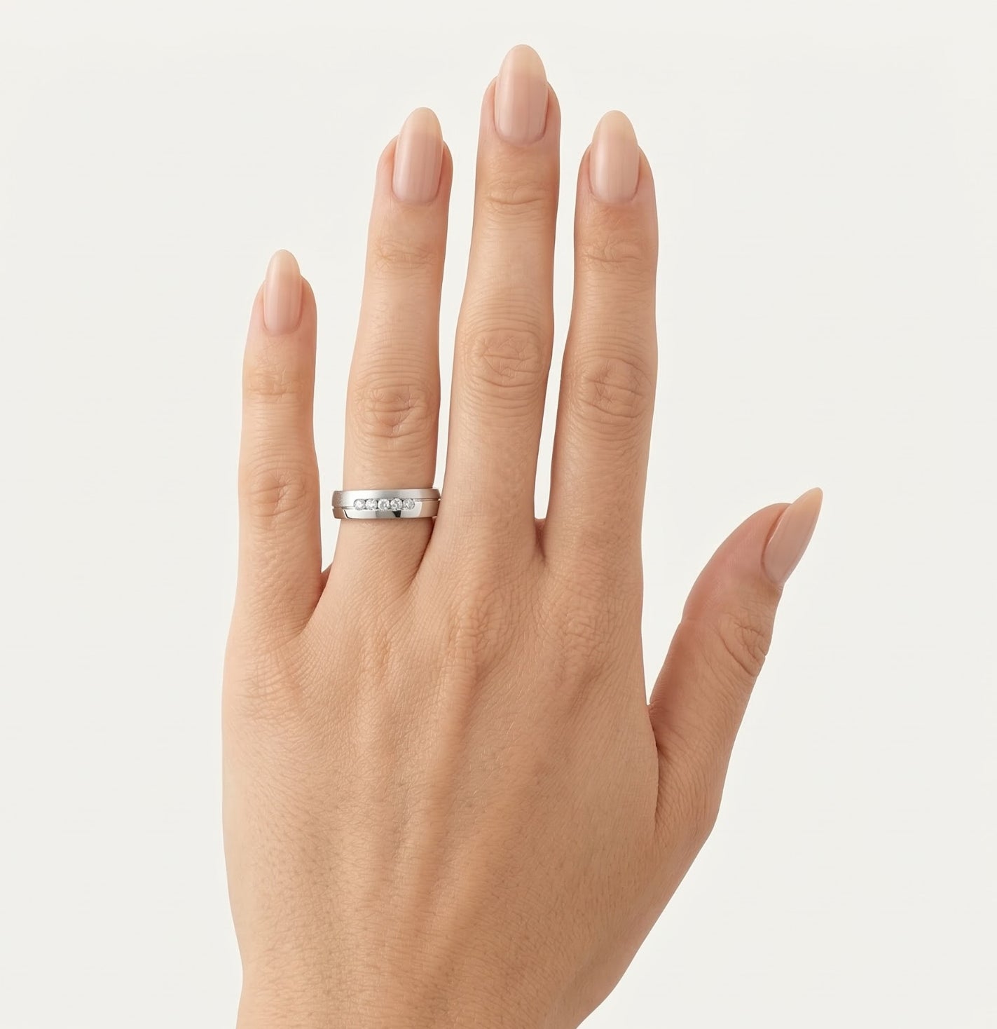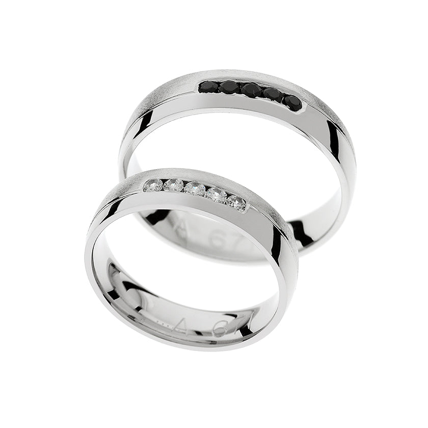 Tento snubní prsten z bílého 14kt zlata, ideální pro ženy i muže, má jedinečný design s polovinou vysoce leštěného a polovinou matného povrchu. Prsten o šířce 5 mm je k dispozici hladký nebo zdobený kubickými zirkony nebo bílými (0,18ct) a černými (0,15ct) diamanty v kulatém jemném stupňovitém výbrusu a kanálkovém zasazení. Dokonalá kombinace elegance a moderního stylu.