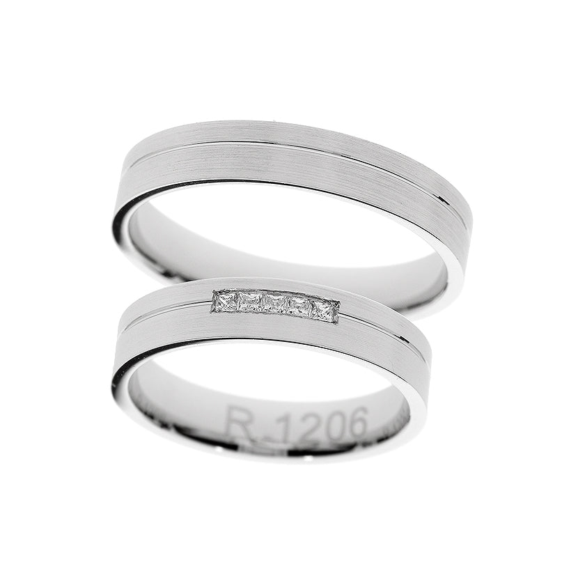 Tento úžasný snubní prsten z bílého 14kt zlata pro muže s elegantním liniovým designem má šíšku 4mm. Můžete si vybrat mezi jednoduchým prstenem nebo prstenem zdobeným 0,15ct čtvercovým zirkonem s princeznovským brusem nebo diamantem, který je zasazen v kanálkovém osazení pro rafinovaný, nadčasový vzhled.