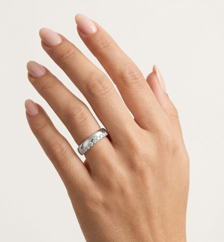 Tento úchvatný snubní prsten z bílého 14kt zlata má jedinečný design s kameny zasazenými podél okraje. Na přání s kubickými zirkony nebo 0,3ct diamantem se honosí osazením zuby a kulatým jemným stupňovitým výbrusem. Tento prsten o tloušťce 5 mm kombinuje klasickou eleganci s moderním vkusem a je ideální pro výjimečný nádech.