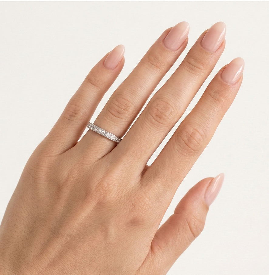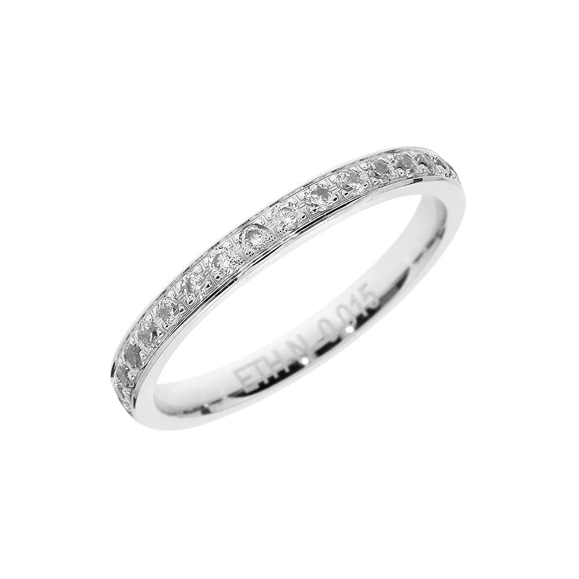 Tento elegantní snubní prsten pro ženy je vyroben z bílého 14karátového zlata o tloušťce 2,3 mm. Prsten se vyznačuje jednoduchým a lesklým designem zdobeným kulatými jemnými stupňovitě broušenými kameny o hmotnosti 0,255 ct v osazení. K dispozici s volitelnými kubickými zirkony nebo diamanty, nabízí nadčasovou eleganci a jemný třpyt.