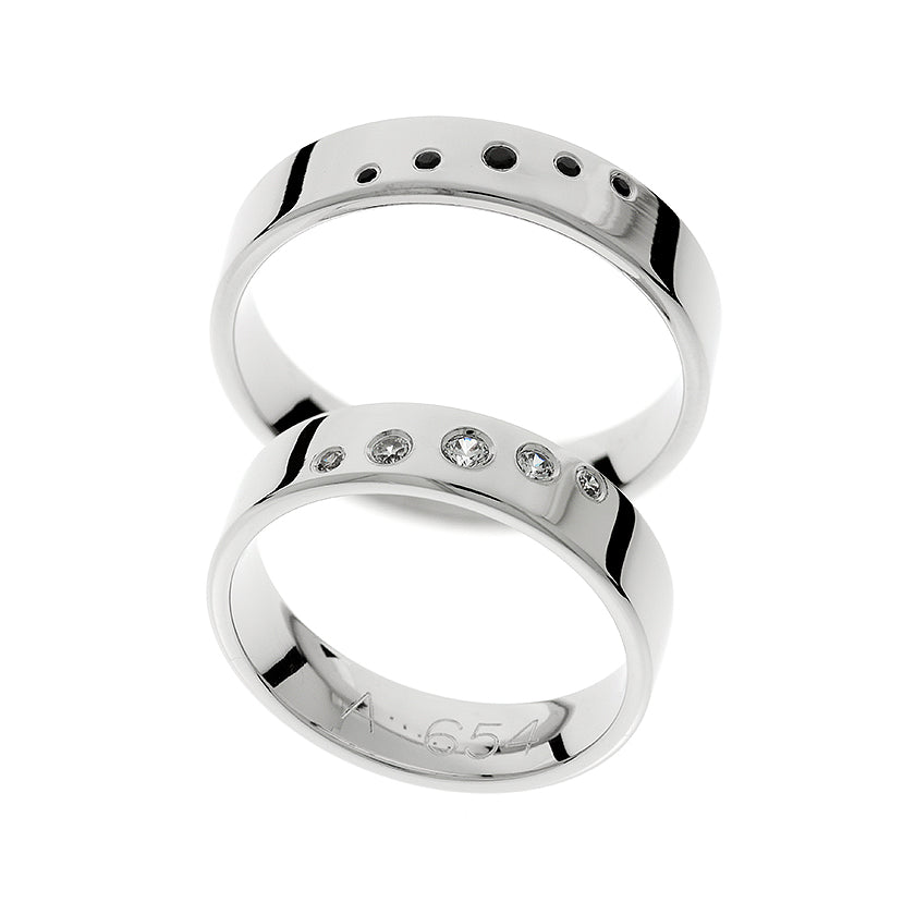 Objevte dokonalý snubní prsten pro ženy a muže ze 14kt bílého zlata o tloušťce 5 mm. Tento stylový design nabízí možnost výběru kubických zirkonů nebo 0,41ct bílých a černých diamantů v kulatém jemném stupňovitém výbrusu, zasazených v rámečku. Vyberte si nadčasový, elegantní šperk, který svým klasickým a zároveň moderním vzhledem doplní jakýkoli styl.
