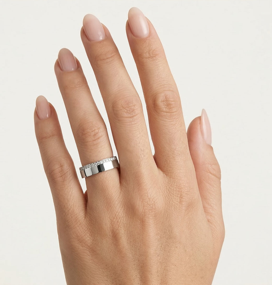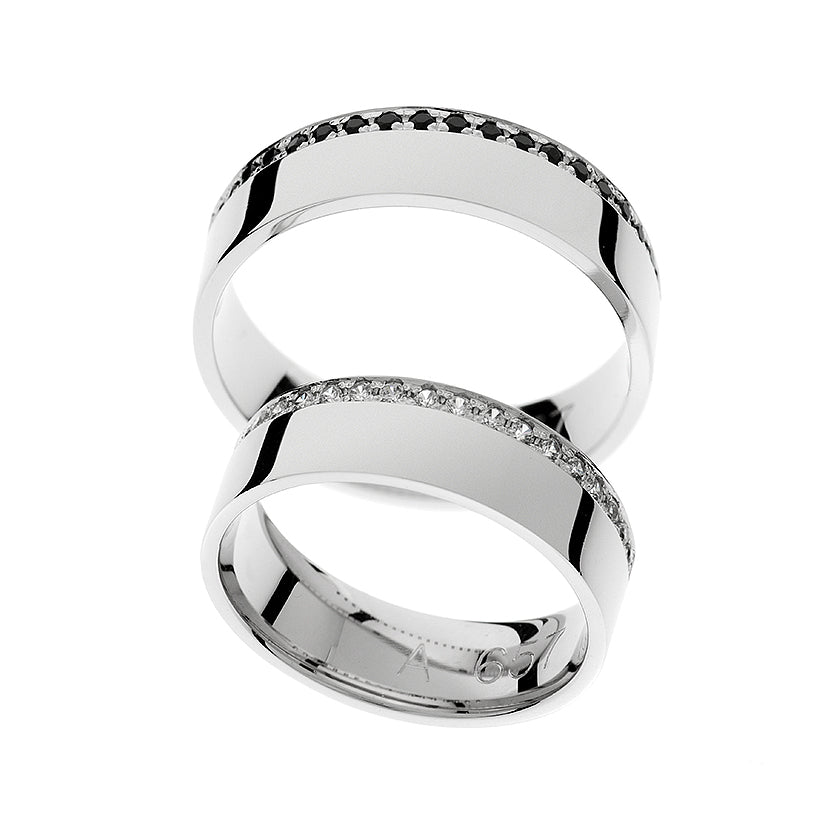 Naše snubní prsteny z bílého 14kt zlata pro ženy a muže mají stylovou tloušťku 6 mm a volitelné kameny. Vyberte si mezi kubickými zirkony nebo jemnými stupňovitě broušenými diamanty s 0,18kt bílými a 0,20kt černými diamanty v zasazení se zářezem. Kameny jsou elegantně zasazeny na okraji prstenu a dodávají mu jedinečný a sofistikovaný nádech.