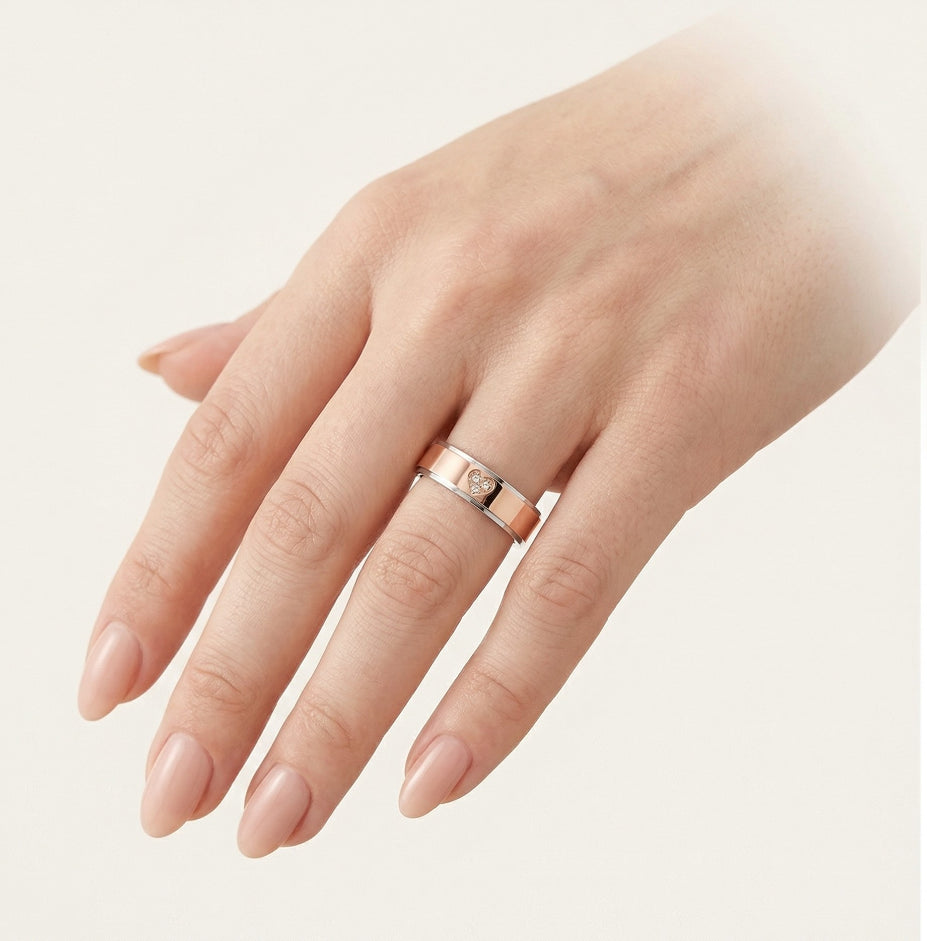 Tento jedinečný snubní prsten z bílého a růžového 14kt zlata má výrazný motiv srdce. 5 mm silný prsten je k dispozici v hladkém provedení nebo s 0,024ct kubickým zirkonem či diamantem v zasazení. Je ideální pro ženy i muže a představuje moderní symbol lásky.