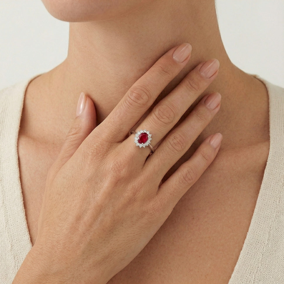 Tento úchvatný prsten zdobí kulaté diamanty s jemným stupňovitým brusem a oválný rubín s jemným stupňovitým brusem, zasazené v luxusním 14kt bílém zlatě s klasickým zasazením. Tento nádherný šperk je vhodný pro královskou rodinu a vyzařuje eleganci a sofistikovanost.