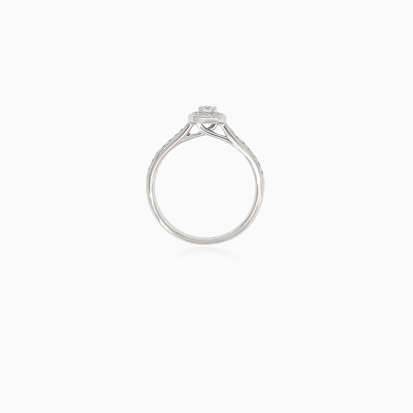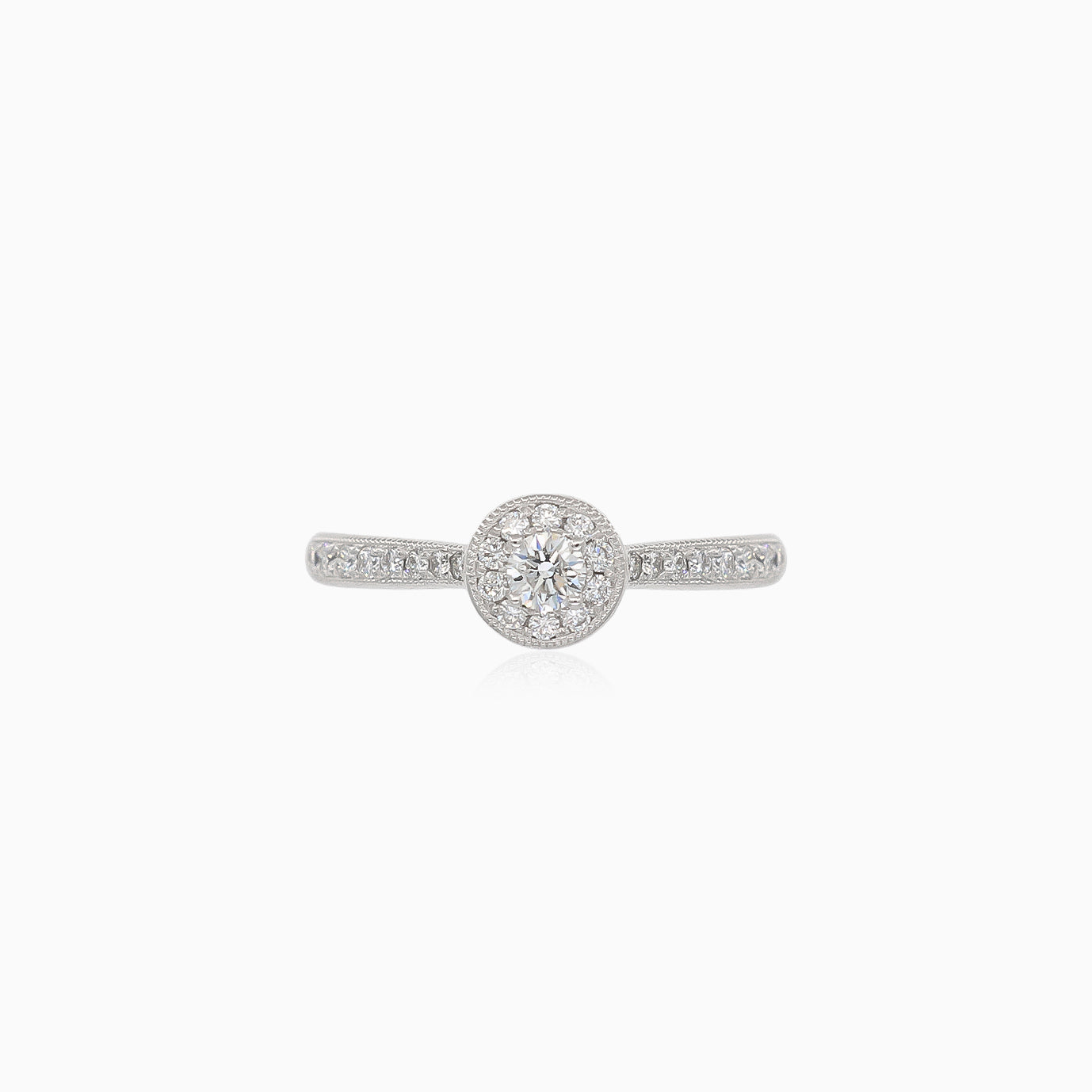 Pozvedněte svůj milostný příběh tímto klasickým minimalistickým dámským zásnubním prstenem s kulatými diamanty s jemným stupňovitým brusem čistoty SI1 barvy H, zvýrazněným jemnými postranními kameny. Prsten je vyroben ze 14kt bílého zlata s osazením zářezem a symbolizuje trvalou eleganci a nadčasovou krásu.