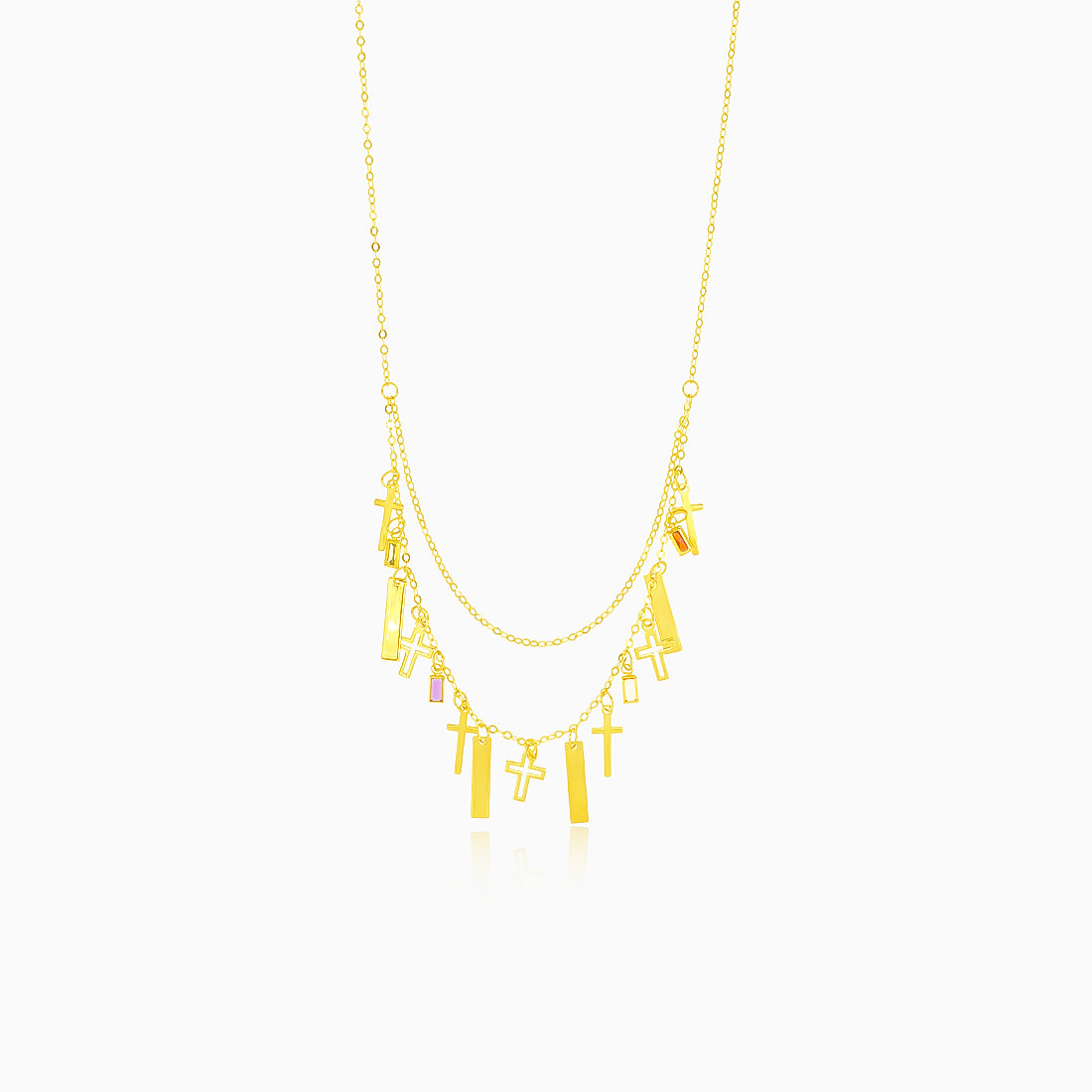 Tento 14 karátový zlatý náhrdelník jedinečně kombinuje dva řetízky. Zatímco jeden je jednoduchý, druhý je zdoben kříži, obdélníkovými destičkami a kombinací kamenů, jako jsou syntetický smaragd, granát, kubický zirkon a ametyst. Náhrdelník je vybaven pružinovým kroužkovým zápínáním.
