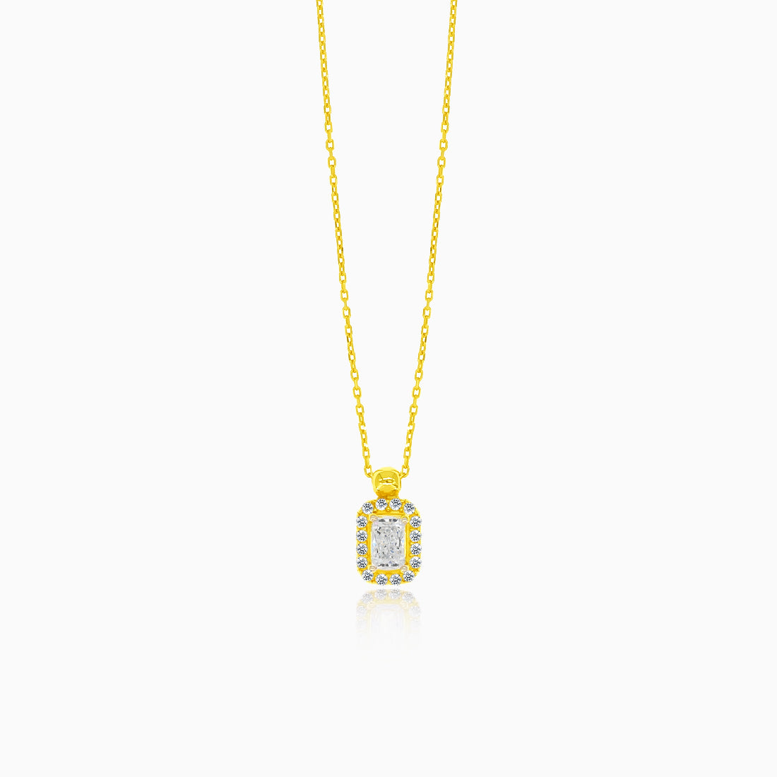 Tento královský solitér je vyroben z 14kt žlutého zlata s kubickým zirkonem v radiant brusu. Okolní drobné zirkony dodávají celému přívěsku královský vzhled. Náhrdelník má pružné kroužkové zapínání.