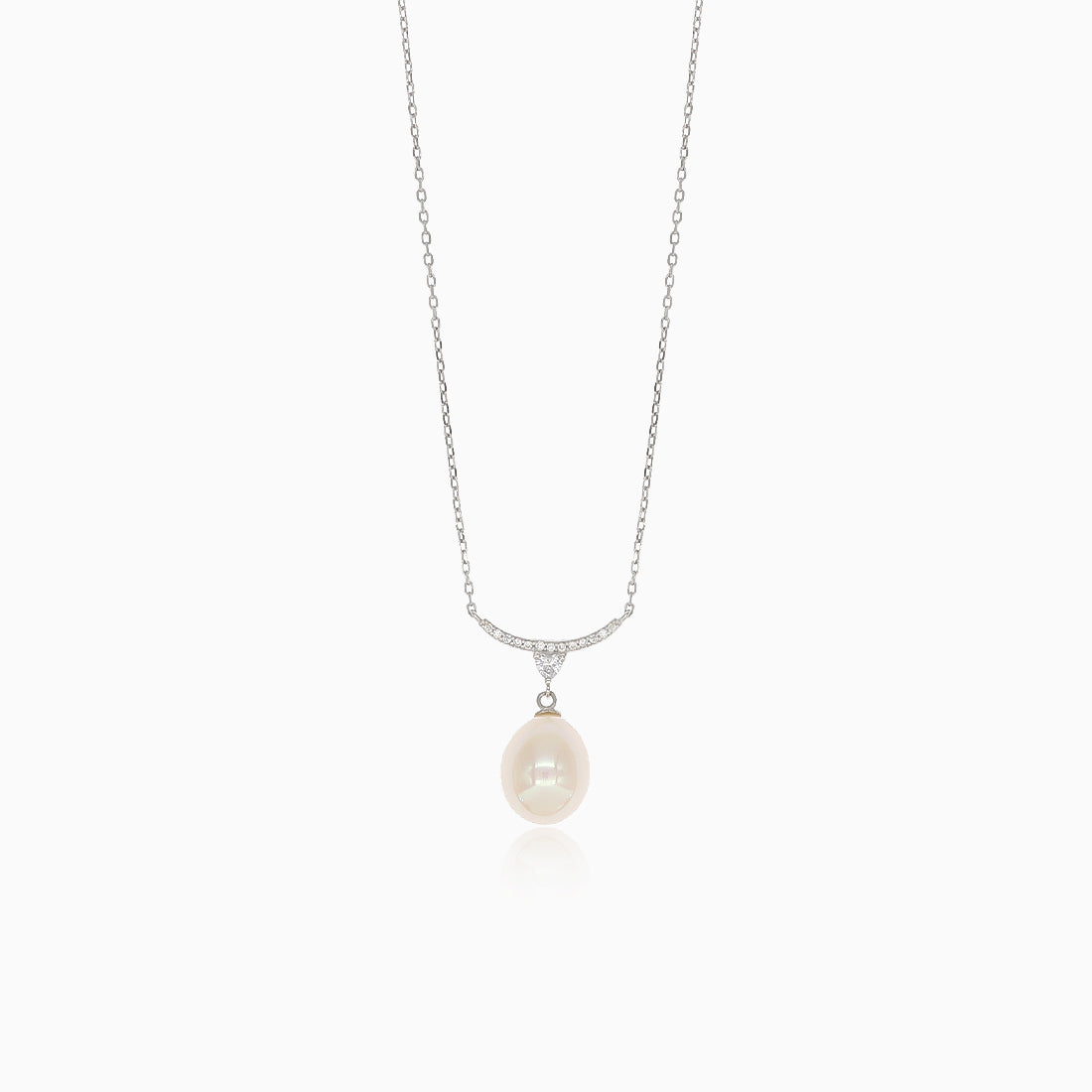 Tento jemný řetízkový náhrdelník je vyroben ze sterilního stříbra 925. Jeho hlavním dominantním prvkem je velká oválná bílá perla, která je doplněna elegantním designem lemu, ve kterém jsou malé kubické zirkony briliantového výbrusu. Jako uzávěr se používá pružná kruhová spona, která šperk pevně drží na místě.