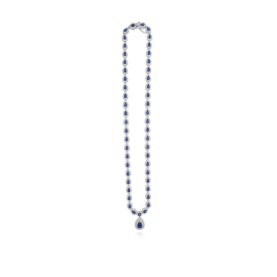 Tento stříbrný náhrdelník se svatozáří má syntetický safír v elegantním hruškovém jemném stupňovitém výbrusu, obklopený kulatými drobnými stupňovitě broušenými zirkony zasazenými do zářezu. Tento nadčasový šperk, zajištěný otevřeným zapínáním, je ideální pro dodání sofistikovanosti každému outfitu.