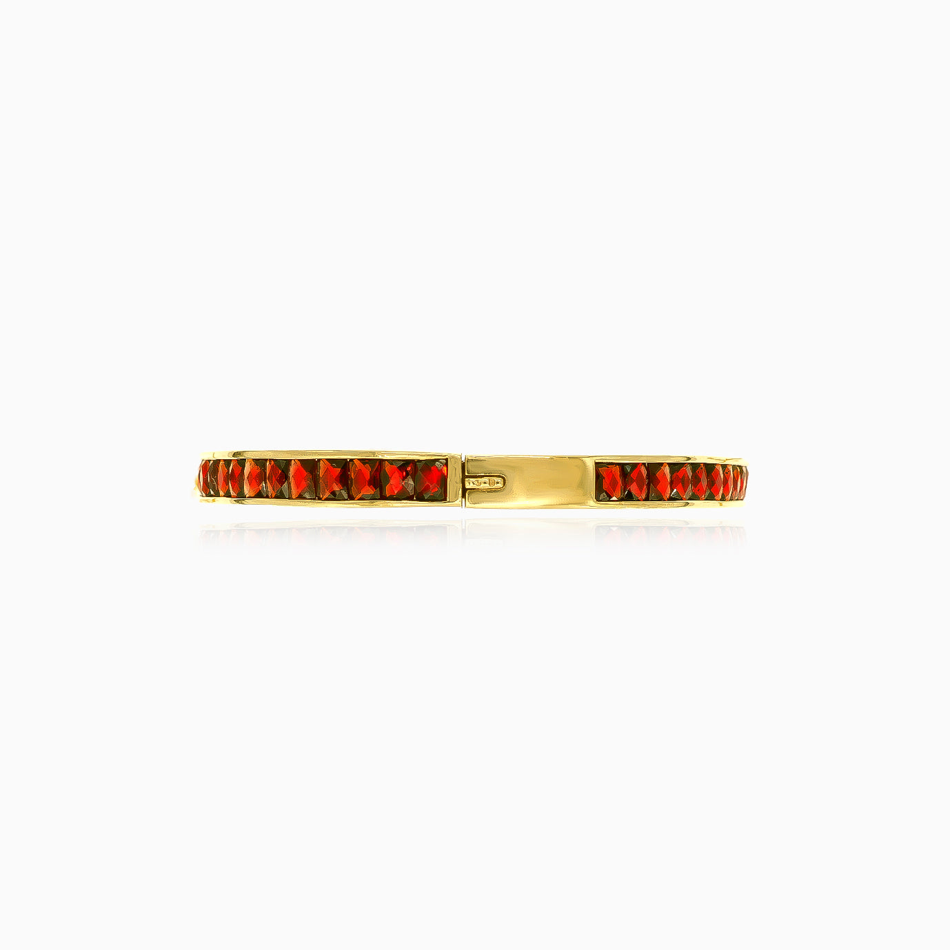 Ozdobte své zápěstí náramkem s čtvercovými granáty s princeznovským brusem zasazenými ve 14kt žlutém zlatě s elegantním kanálkovým zasazením. Náramek se zapíná na otevřenou sponu a dodá každému kompletu nádech luxusu.