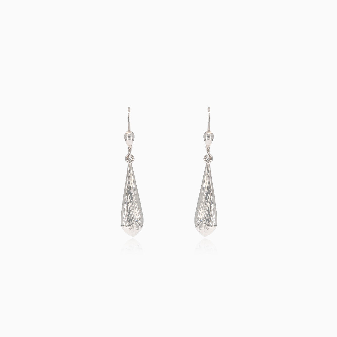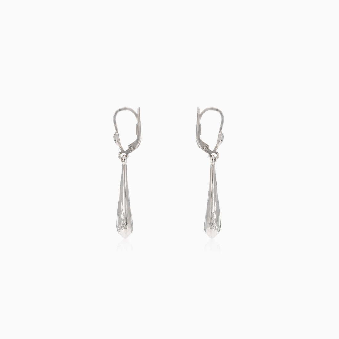 Tyto elegantní visací náušnice jsou vyrobeny z 14kt bílého zlata a mají tvar podlouhlé kapky. Jsou zdobeny vyřezávaným designem, který tvoří jemné linky, a vynikají vysokým leskem. Šperk je vybaven anglickým patentem pro bezpečné nošení.