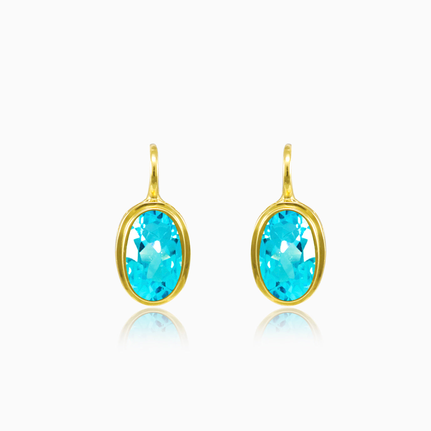 Tyto náušnice jsou vyrobeny z klasického žlutého zlata 14kt a mají oválné topazy v lunetovém osazení.