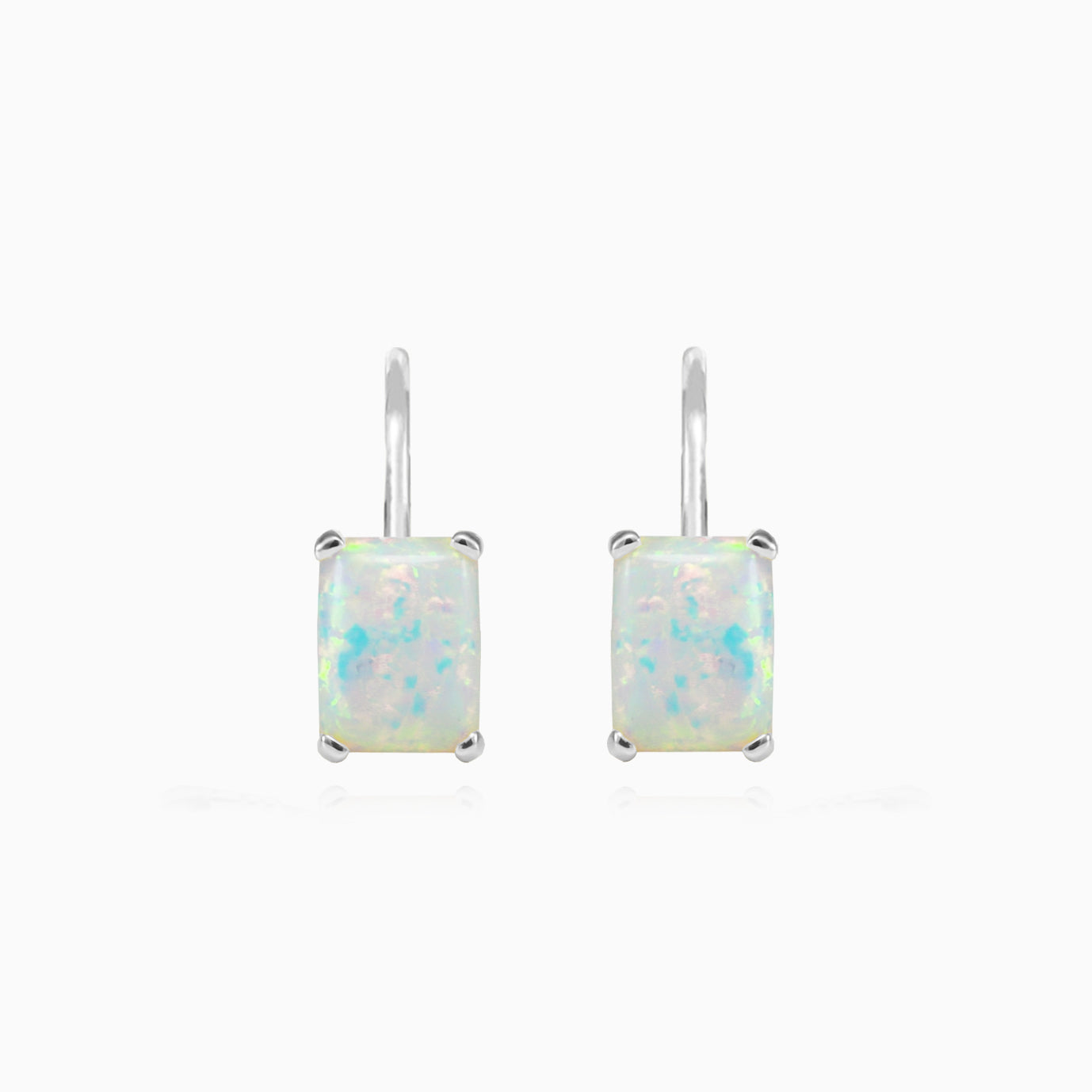 Tyto dámské náušnice z bílého 14kt zlata jsou zdobeny bílým opálem s obdélníkovým kabošonem, zasazeným v klasickém zasazení a zapínáním na páčku. Její solitérní design podtrhuje přirozenou krásu opálu a nabízí nadčasový a elegantní šperk, který s nádechem sofistikovanosti doplní každý styl.