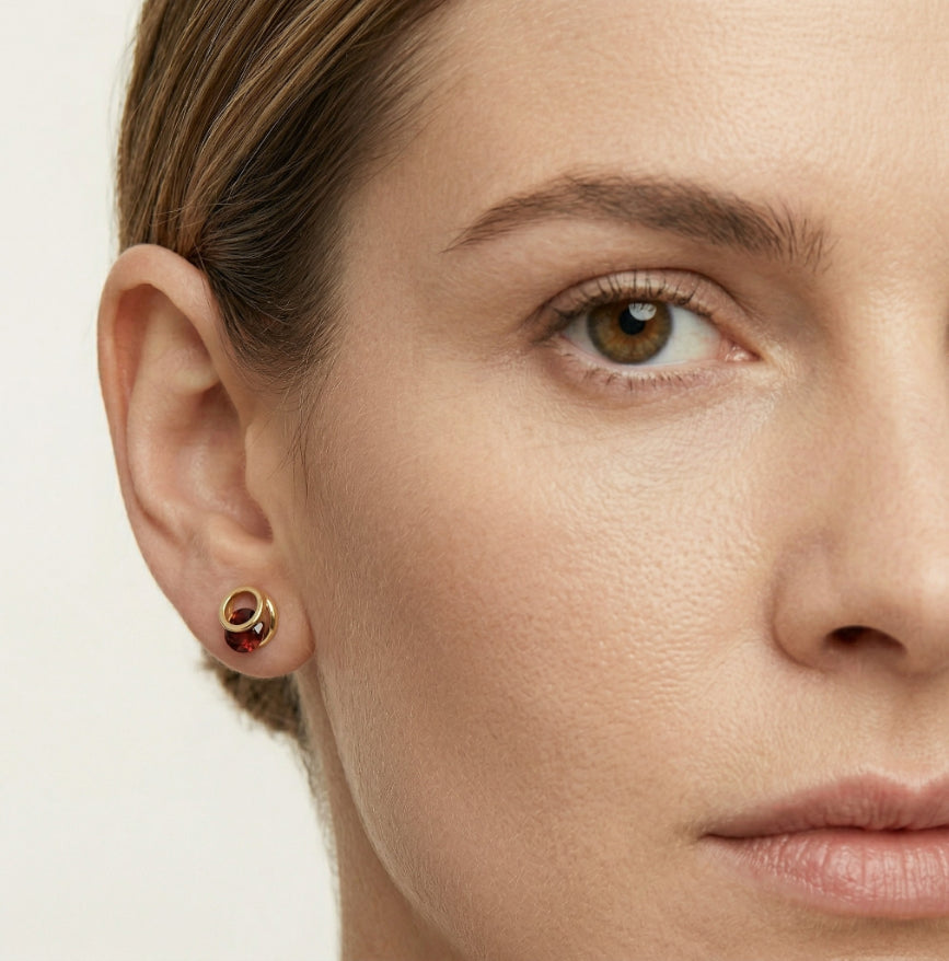 Zažijte věčnou zář s našimi dámskými náušnicemi s podmanivým granátem s kulatým jemným stupňovitým brusem, elegantně zasazeným do 14kt žlutého zlata s napínacím zasazením a puzetovým zapínáním. Tento nebeský design dodá vaší sbírce nádech tajemství a moderní elegance.