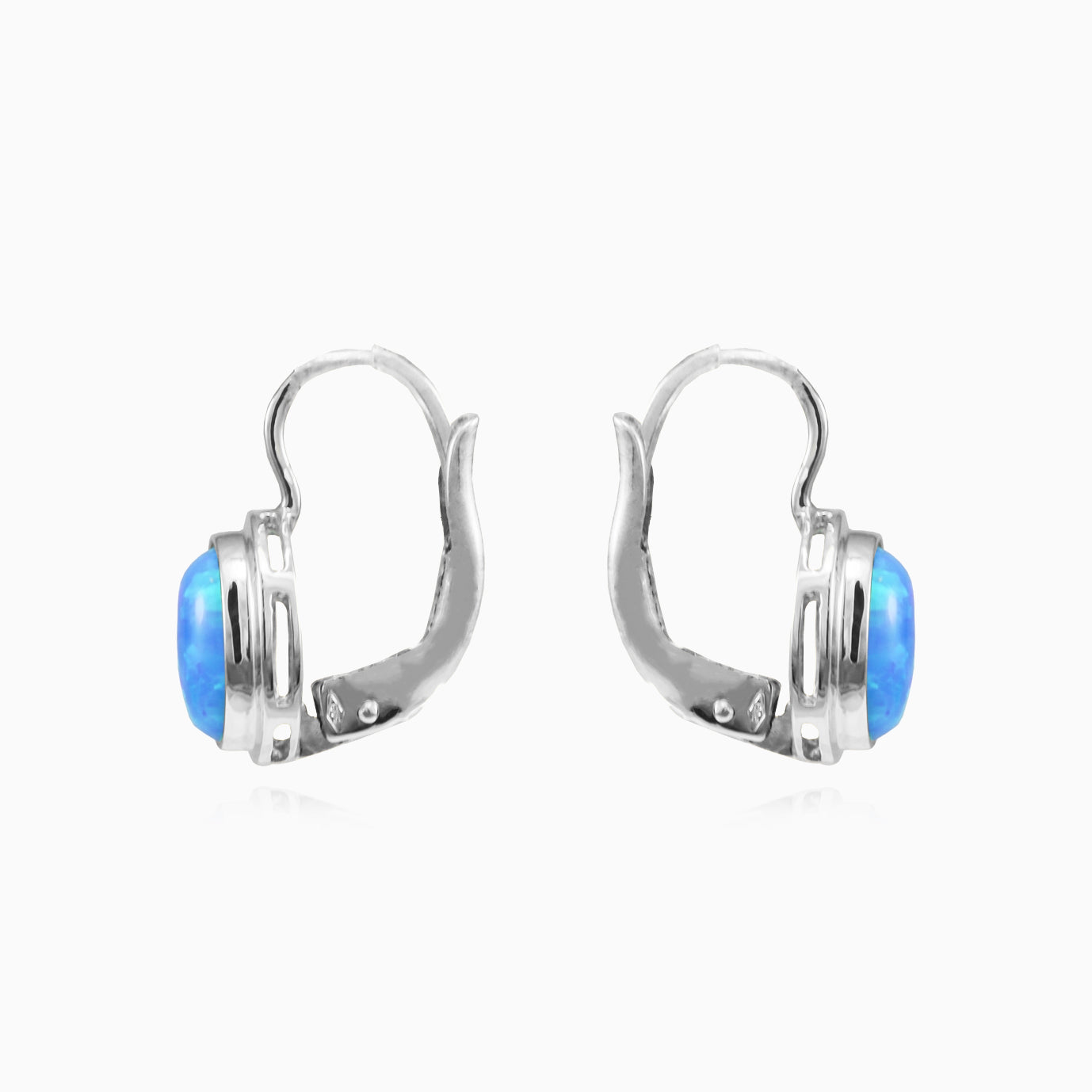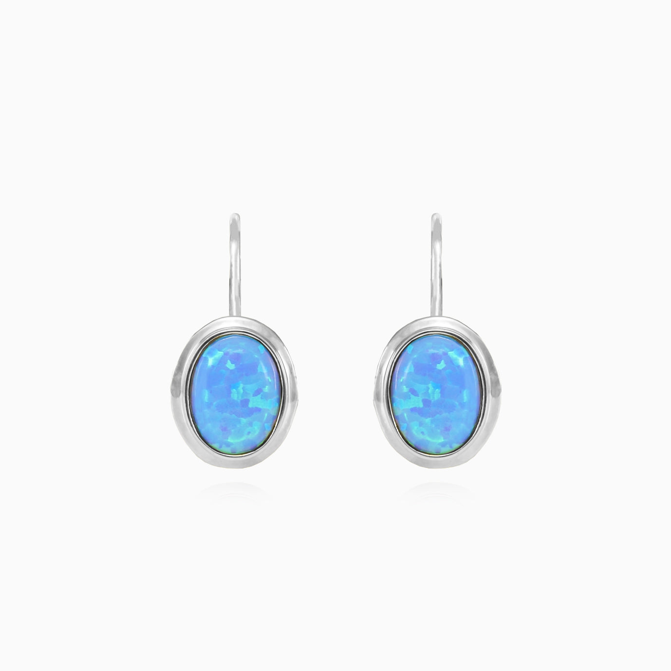 Tyto dámské náušnice jsou vyrobeny z bílého 14karátového zlata a mají fascinující modrý opál v oválném kabošonovém výbrusu. Jsou zasazeny do hladkého rámečku a zajištěny zapínáním na páčku a nabízejí rafinovaný, elegantní styl ideální pro každou příležitost.