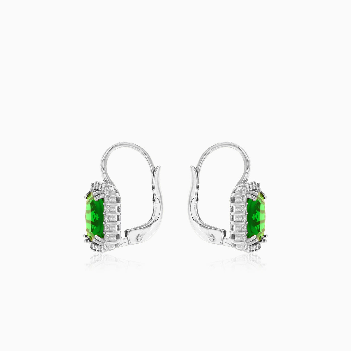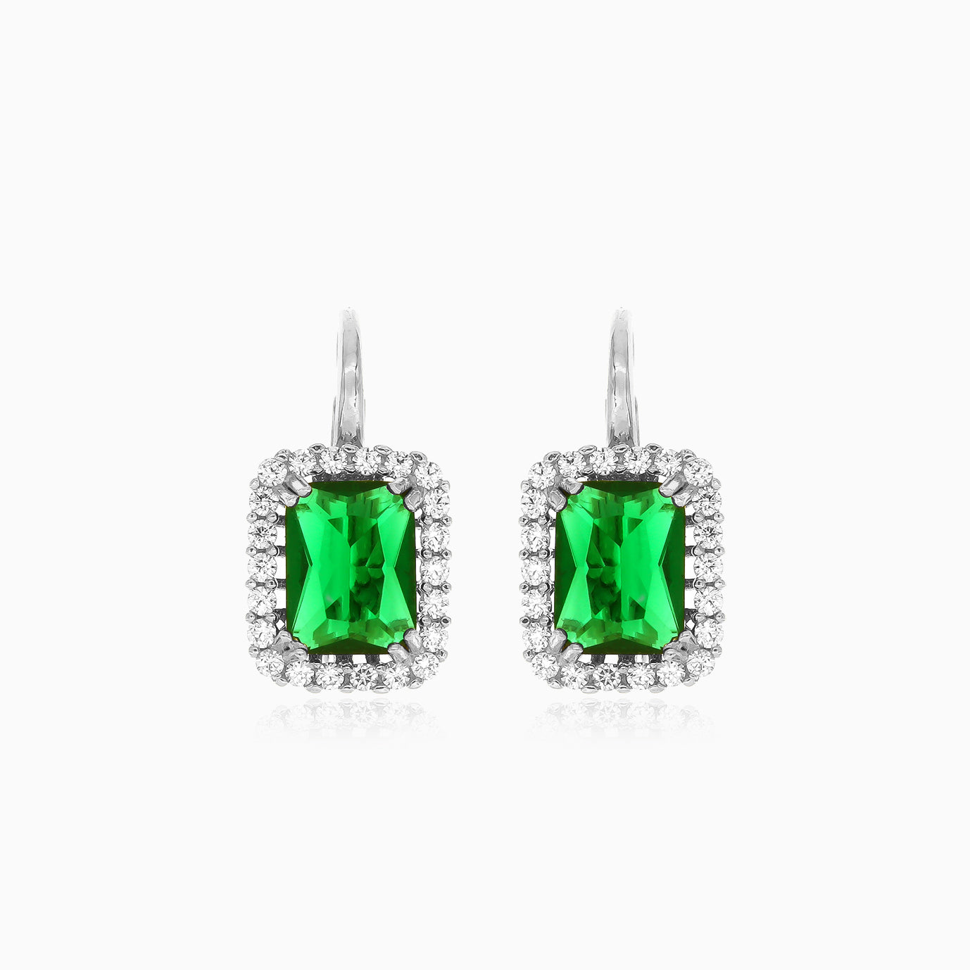 Tyto dámské visací náušnice ze 14karátového bílého zlata zdobí uprostřed syntetický smaragd s krokovým výbrusem, obklopený třpytivými kulatými drobnými zirkony s krokovým výbrusem. Náušnice jsou zasazeny v puzetovém zapínání s pákovým uzávěrem a odrážejí královskou a rafinovanou eleganci.