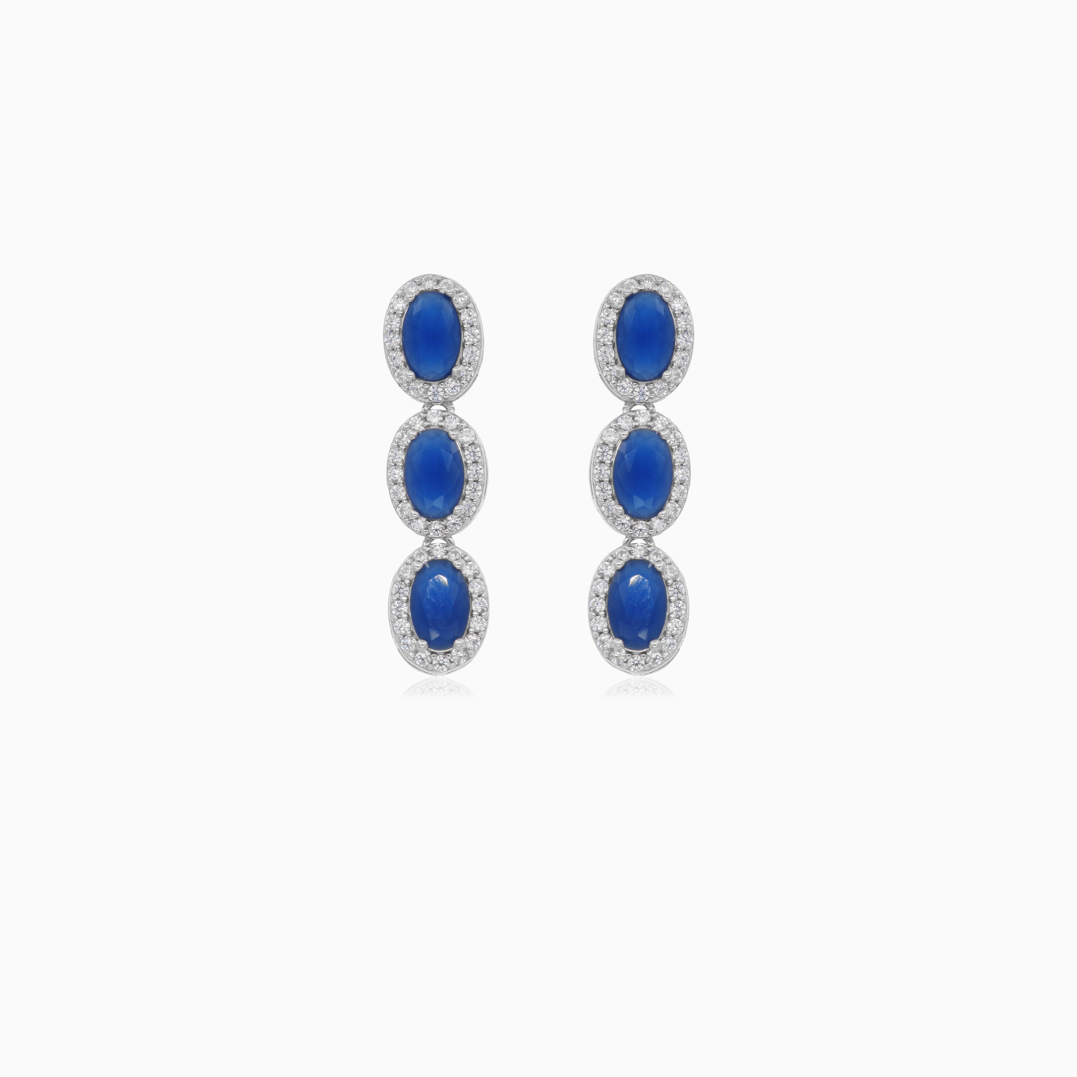Elegantní a poutavé stříbrné náušnice s kapkou mají trojici syntetických safírů oválného brusu, které se krásně kaskádovitě střídají a jsou obklopeny svatozáří kulatých kubických zirkonů s jemným stupňovitým brusem. Tyto náušnice, zakončené bezpečným puzetovým zapínáním, dodají každému vzhledu nadčasový třpyt.