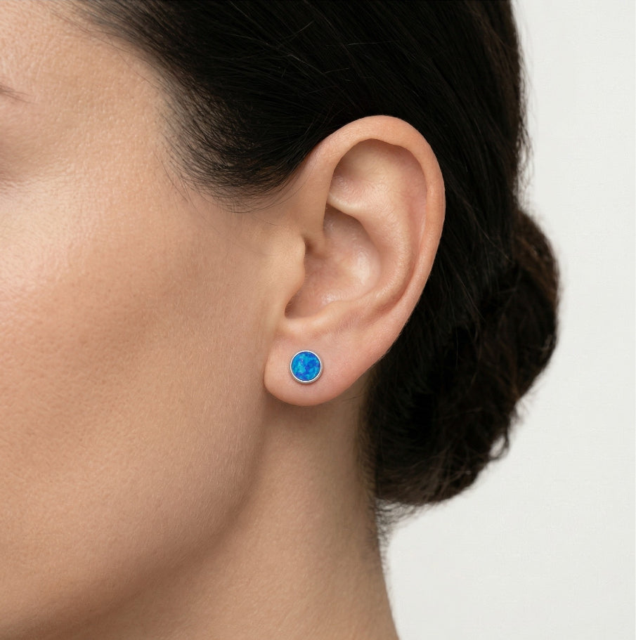 Tyto nadčasové stříbrné náušnice mají zářivý modrý opál kulatého brusu, který je bezpečně zasazen v rámečku a působí rafinovaně. Jednoduchý design, vhodný pro muže i ženy, se páruje s puzetovým zapínáním, které zajišťuje pohodlné nošení, a činí tyto univerzální náušnice ideálními pro každodenní nošení.
