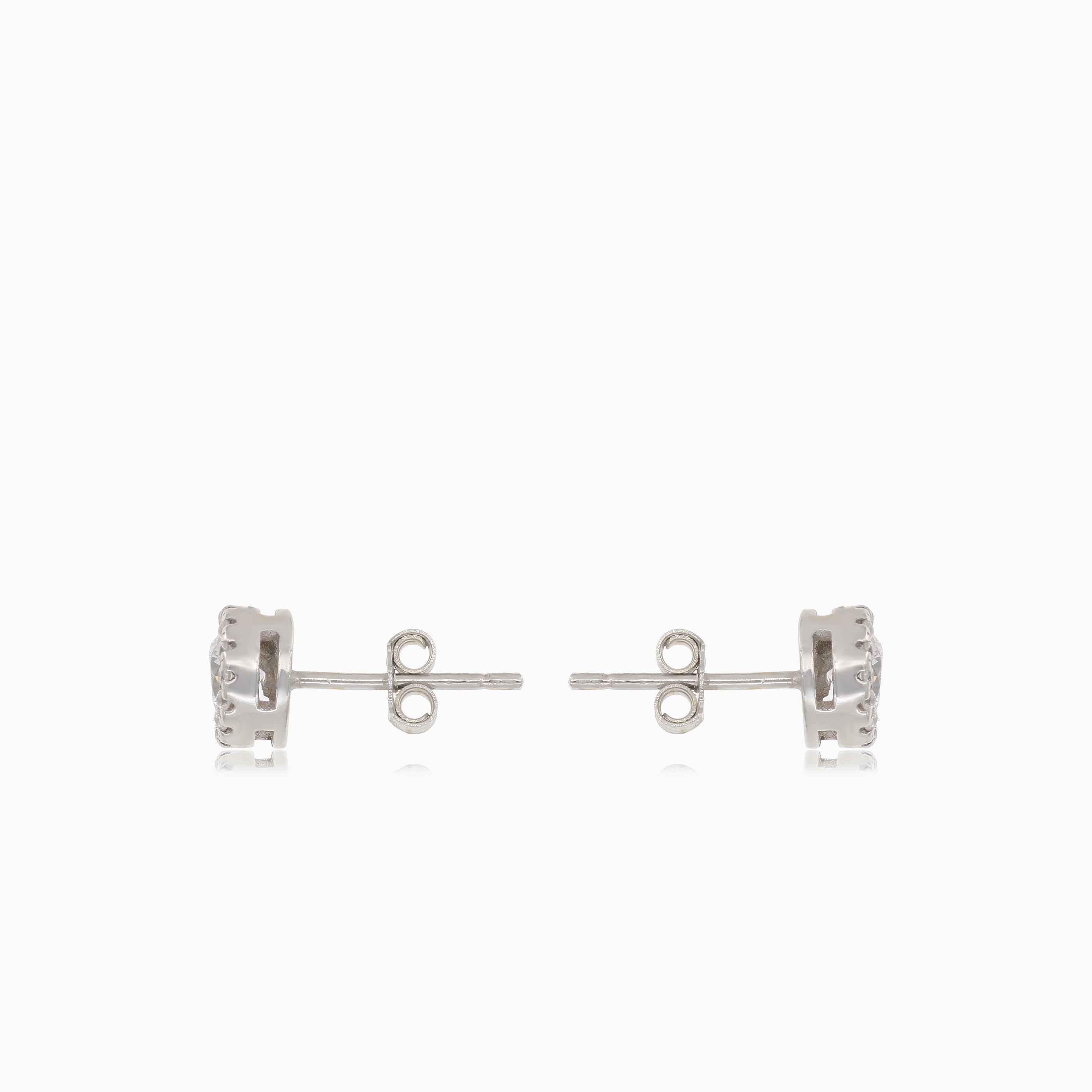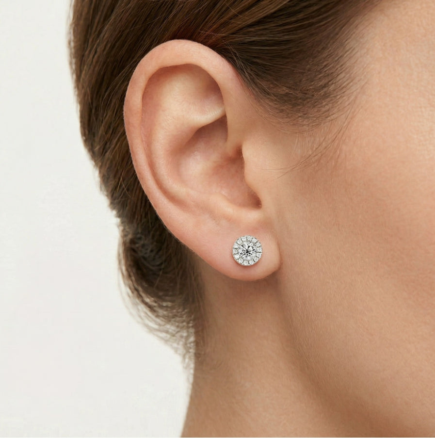 Elegantní stříbrné náušnice s centrálním zirkonem obklopeným menšími zirkony pro větší třpyt a sofistikovanost.