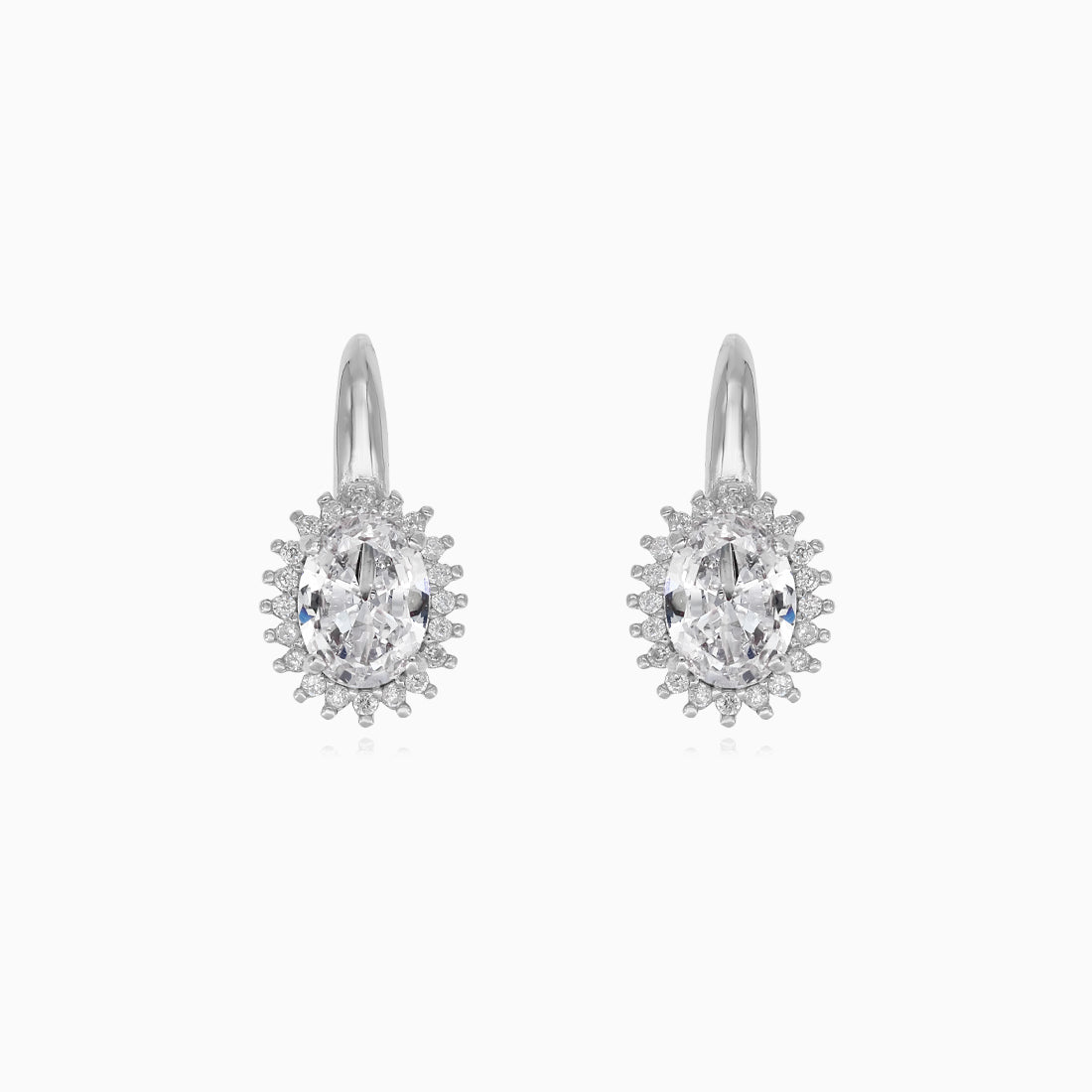Pozvedněte svou eleganci s těmito stříbrnými náušnicemi ve tvaru svatozáře s centrálním oválným kubickým zirkonem obklopeným kulatými jemnými stupňovitě broušenými kameny. Ozdobné afroháčky zvýrazňují lesk kamenů a zapínání na páčku zajišťuje bezpečné a pohodlné nošení pro každou příležitost.