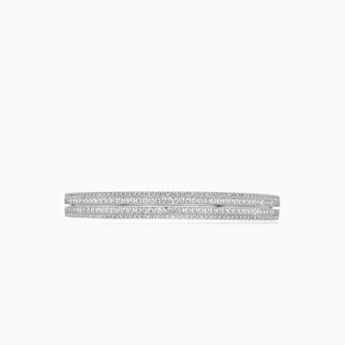 Tento stříbrný náramek se dvěma řadami čtvercových kubických zirkonů s výbrusem princess v kanálkovém zasazení, které jsou ústředním prvkem, doplněným řadou kulatých jemných stupňovitě broušených kamenů v zářezu. Náramek je zakončen otevřeným zapínáním ve tvaru krabičky a spojuje eleganci s bezpečným nošením pro každou příležitost.