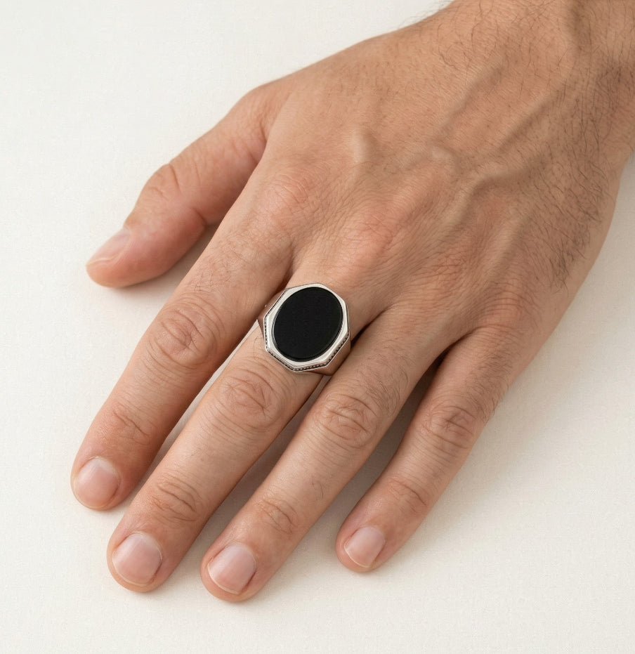 Pánský stříbrný prsten s oválným onyxem, solitér