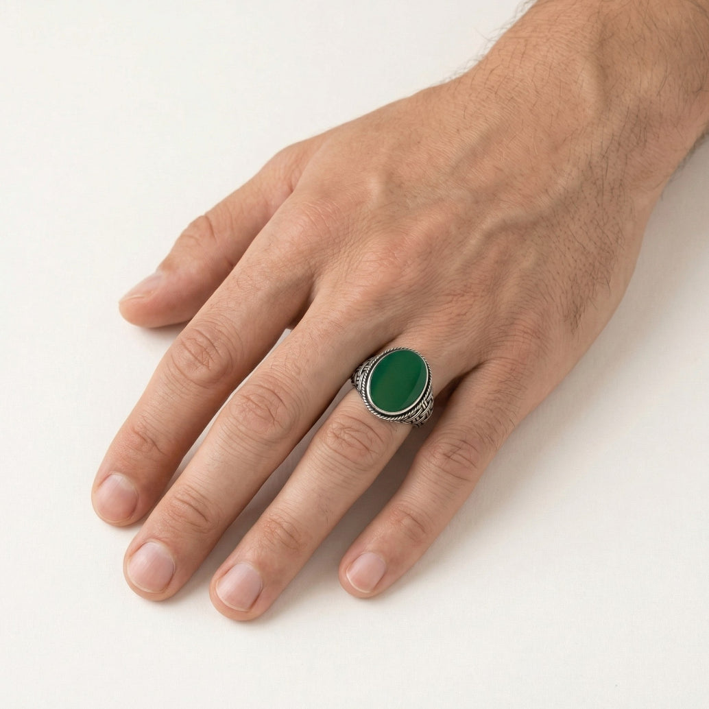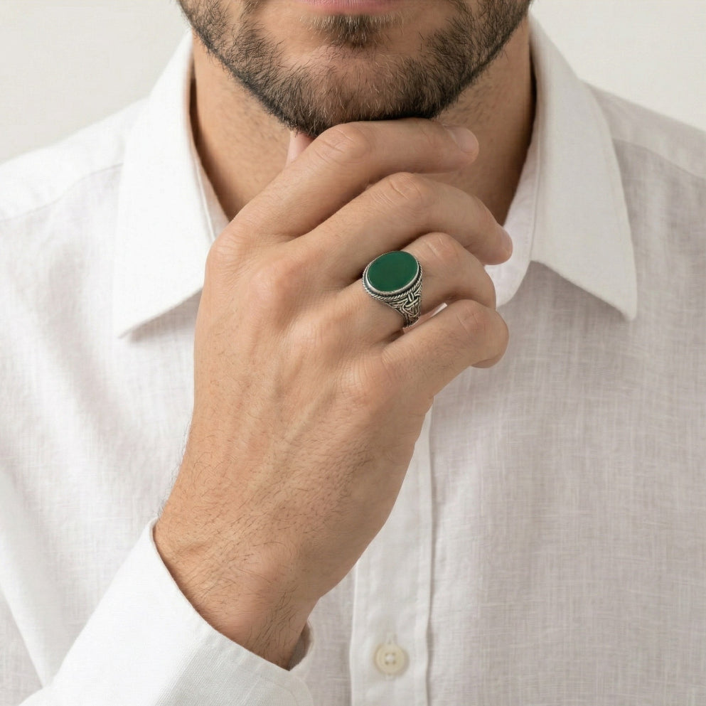 Tento elegantní stříbrný solitaire prsten zvýrazňuje oválný jadeit, který dodává šperku klidnou sílu a výrazný charakter. Minimalistický design podtrhuje osobitý styl každého muže — ideální pro sebevědomé okamžiky i každodenní eleganci.