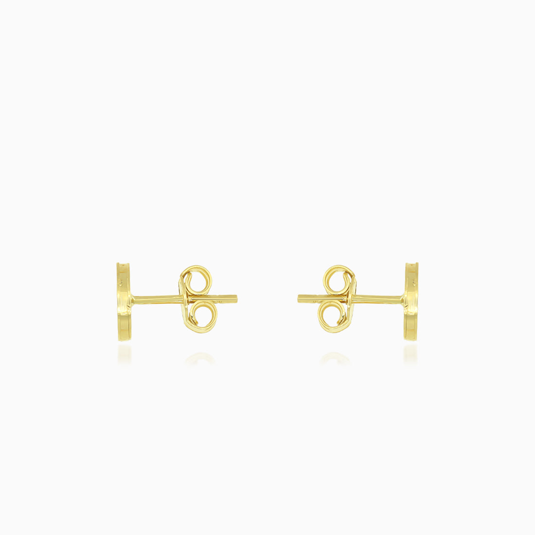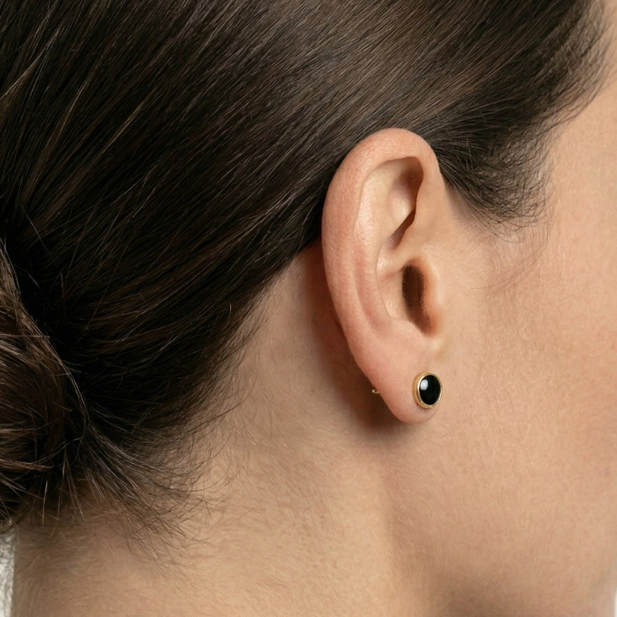 Unisex náušnice ze žlutého 14kt zlata s elegantním černým onyxem plochého brusu, zasazeným v bezpečném rámečku. Puzetové zapínání zajišťuje pohodlné a spolehlivé uchycení, díky čemuž jsou tyto náušnice univerzálním a stylovým doplňkem pro každou příležitost.