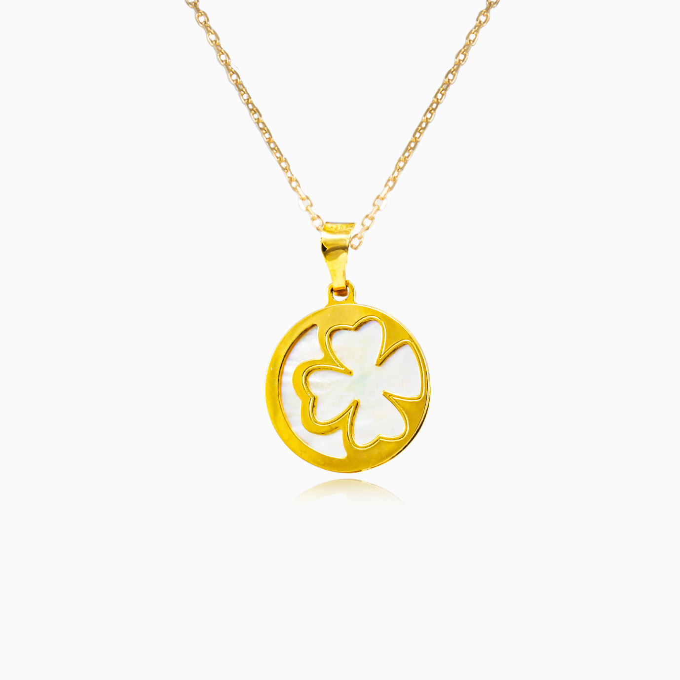 Pozvedněte svůj styl s tímto zlatým 14kt přívěskem ve tvaru čtyřlístku, který je kombinován s perletí.