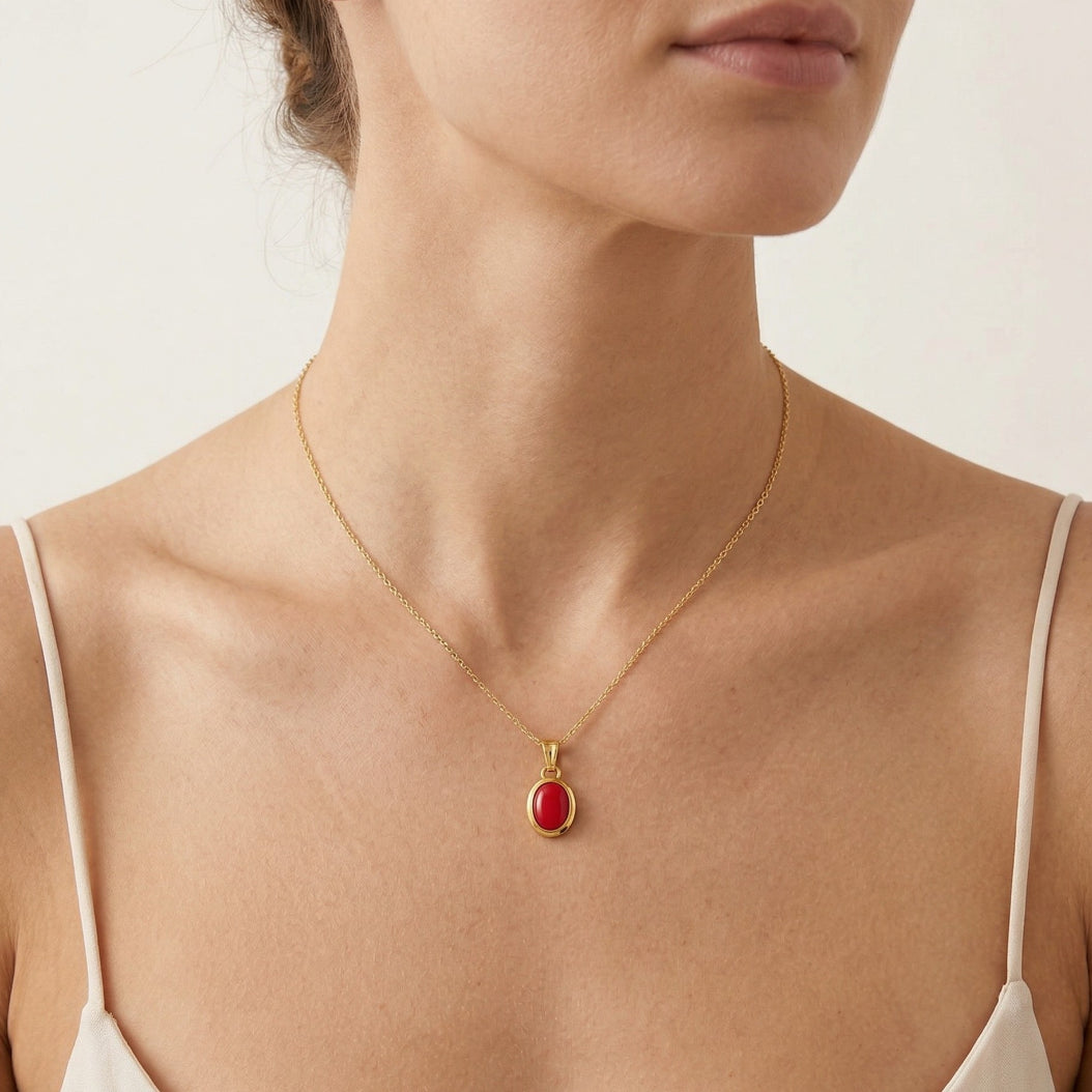 Klasický přívěsek ze 14-karátového žlutého zlata s červeným korálem oválného brusu v luneta osazení.