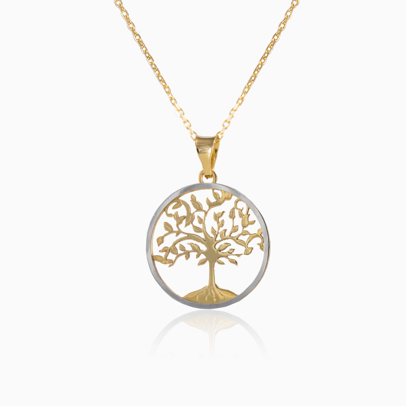 Přívěsek Strom života ze 14-karátového žlutého zlata může být nošen z obou stran. Jedna strana je kombinací bílého a žlutého zlata, druhý strana je pouze žluté zlato.