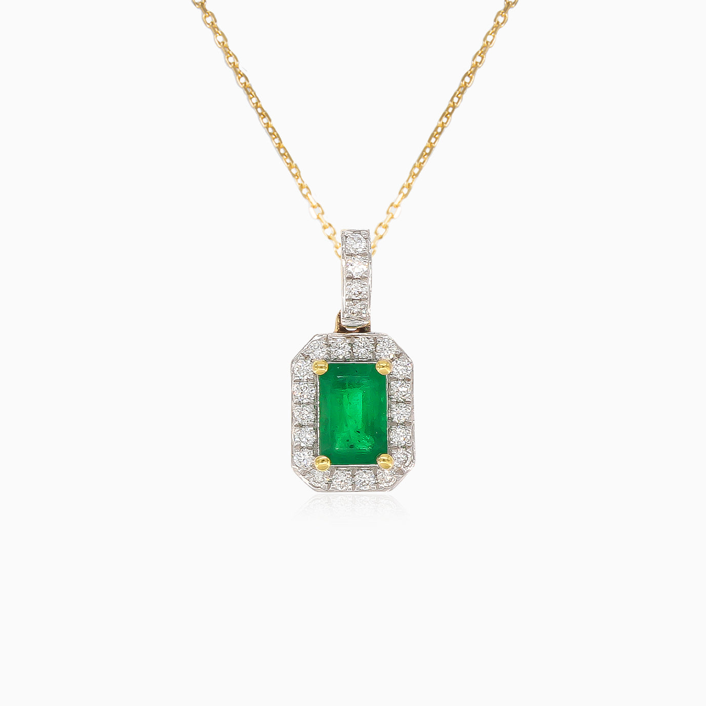Pozvedněte svůj styl tímto nádherným dámským přívěskem s oslnivými diamanty v kulatém jemném stupňovitém výbrusu a zářivým smaragdem ve smaragdovém stupňovitém výbrusu, zasazeným v luxusním 14kt žlutém zlatě s bezpečným zasazením, který nabízí nadčasovou eleganci a sofistikovanost.