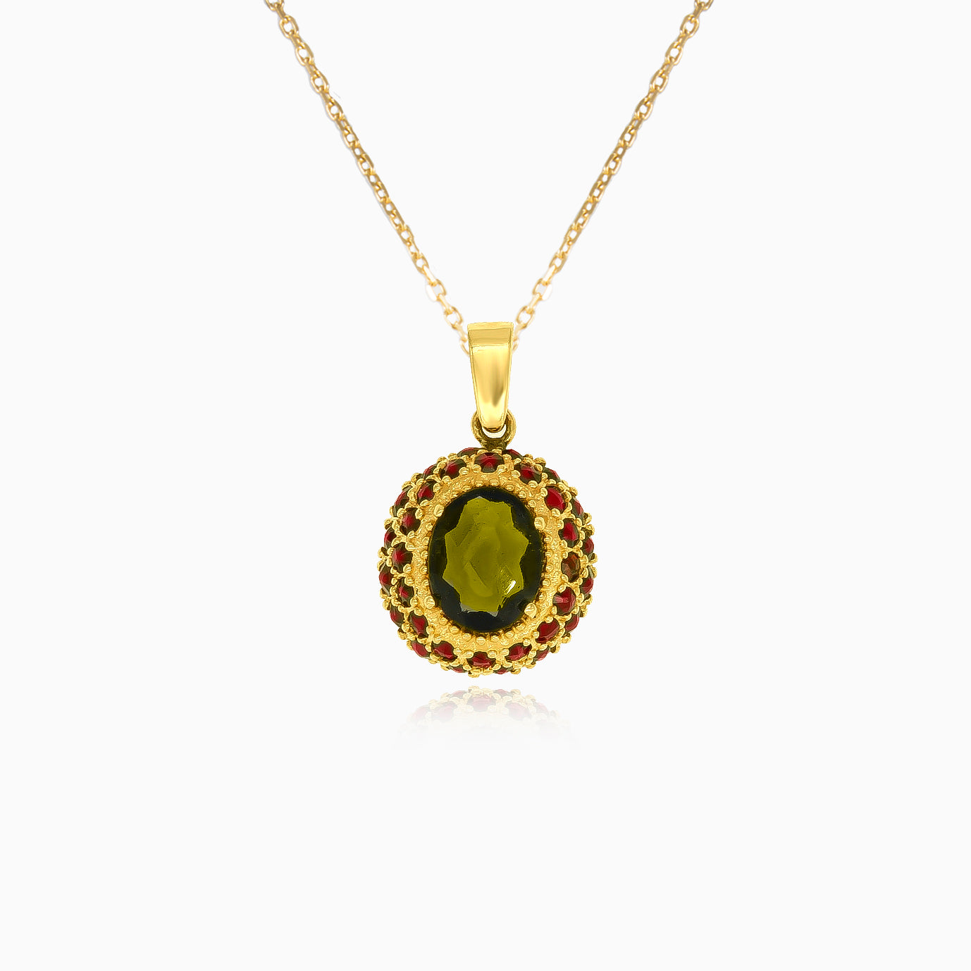 Objevte okouzlení s naším přívěskem ze žlutého 14kt zlata s jemným osazením se 4 hroty. Ústřední bod se pyšní fascinujícím oválným broušeným kamenem vltavínem, který je zvýrazněn leskem granátu v kulatém jemném stupňovitém výbrusu. Tento přívěsek je podmanivou kombinací elegance a sofistikovanosti.
