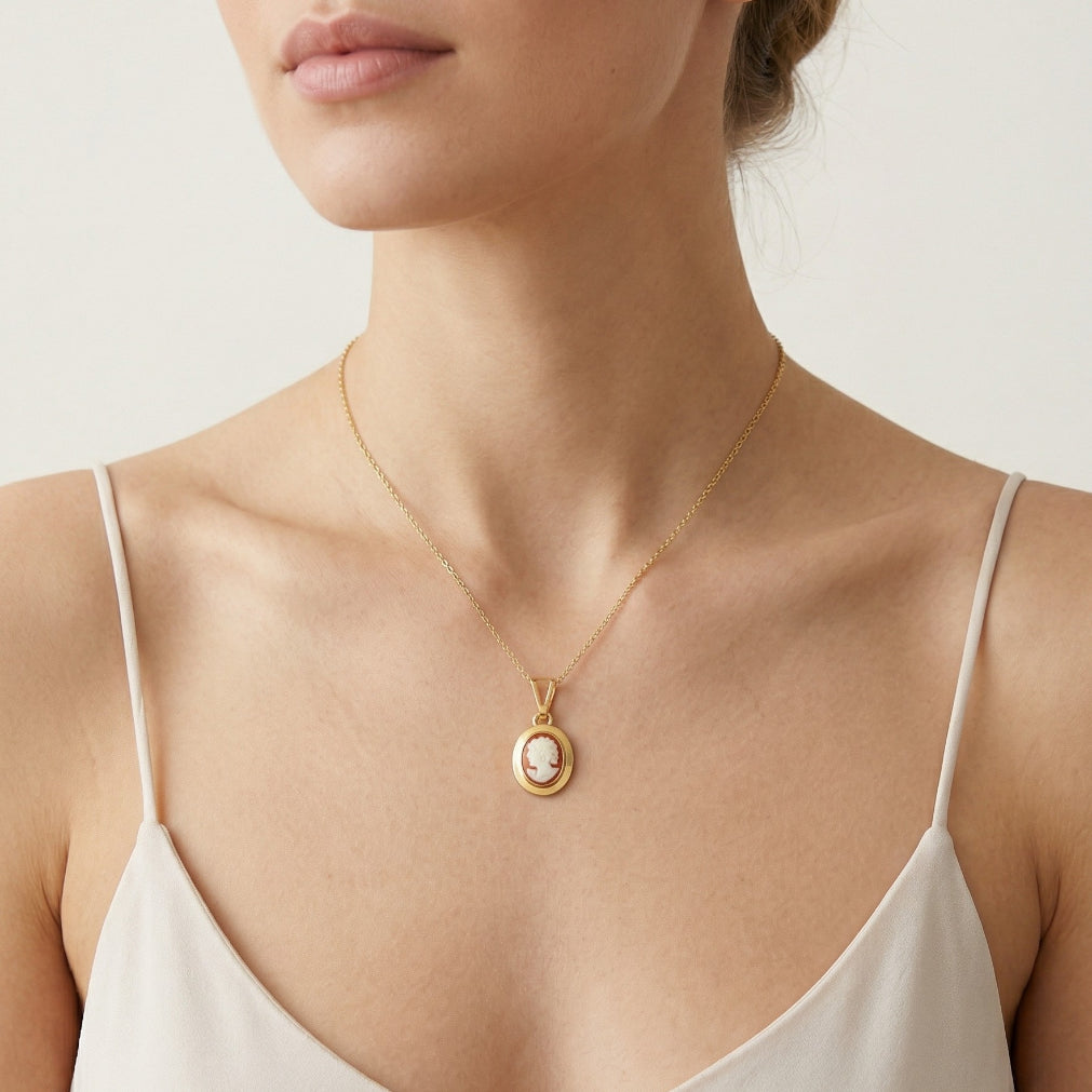Kamej přívěsek na náhrdelník z 14-karátového žlutého zlata a ručně oválně broušeným korálovým kamej na povrchu.