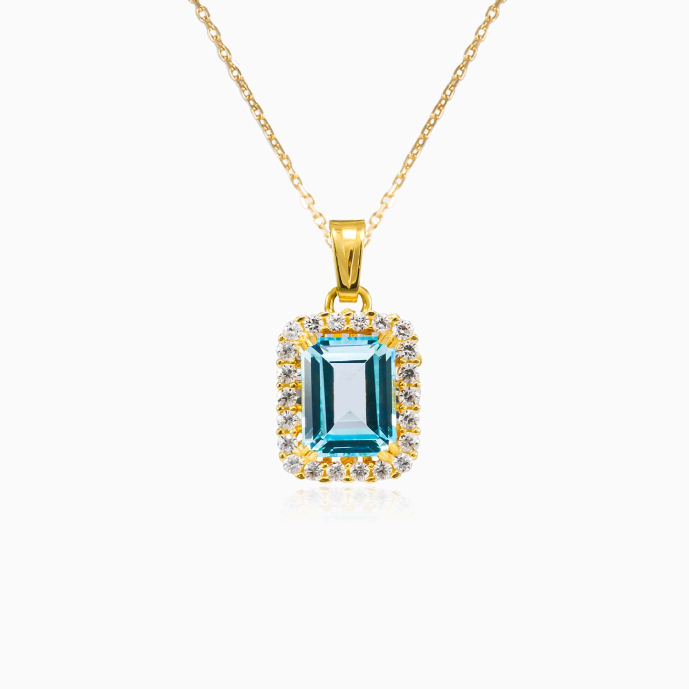Přívěsek z 14-karátového žlutého zlata kombinovaný s topazem emerald brusu a lunetou z kubické zirkonie.