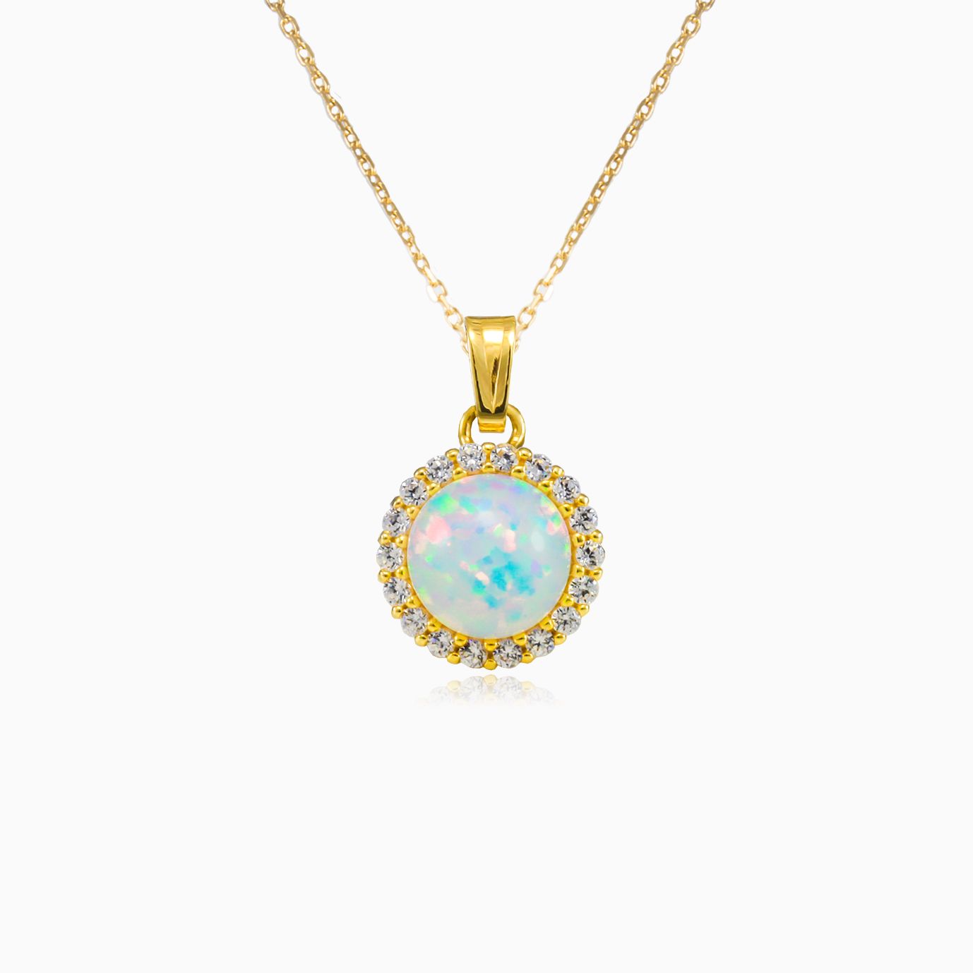 Klasický design přívěsku na náhrdelník z 14-karátového zlata s kulatým bílým opálem obklopeným lunetou z kubické zirkonie.