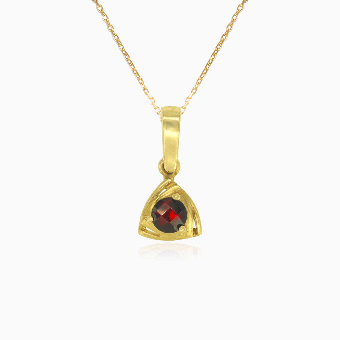 Tento elegantní dámský přívěsek vyrobený ze 14karátového žlutého zlata je osazen úchvatným kulatým granátem jemného stupňovitého brusu v bezpečném zasazení. Jedinečný trojúhelníkový design dodává klasickému granátovému přívěsku moderní nádech a činí z něj výrazný doplněk každé sbírky šperků.