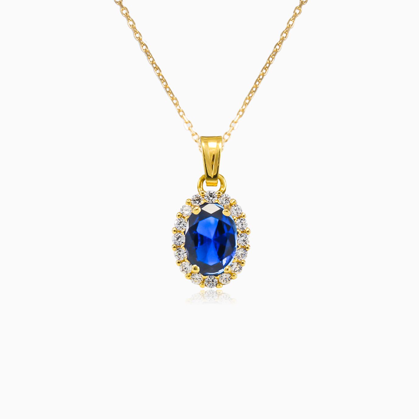 Klasický přívěsek na náhrdelník z 14-karátového žlutého zlata s oválně broušeným syntetickým safírem a aureolou kubické zirkonie.