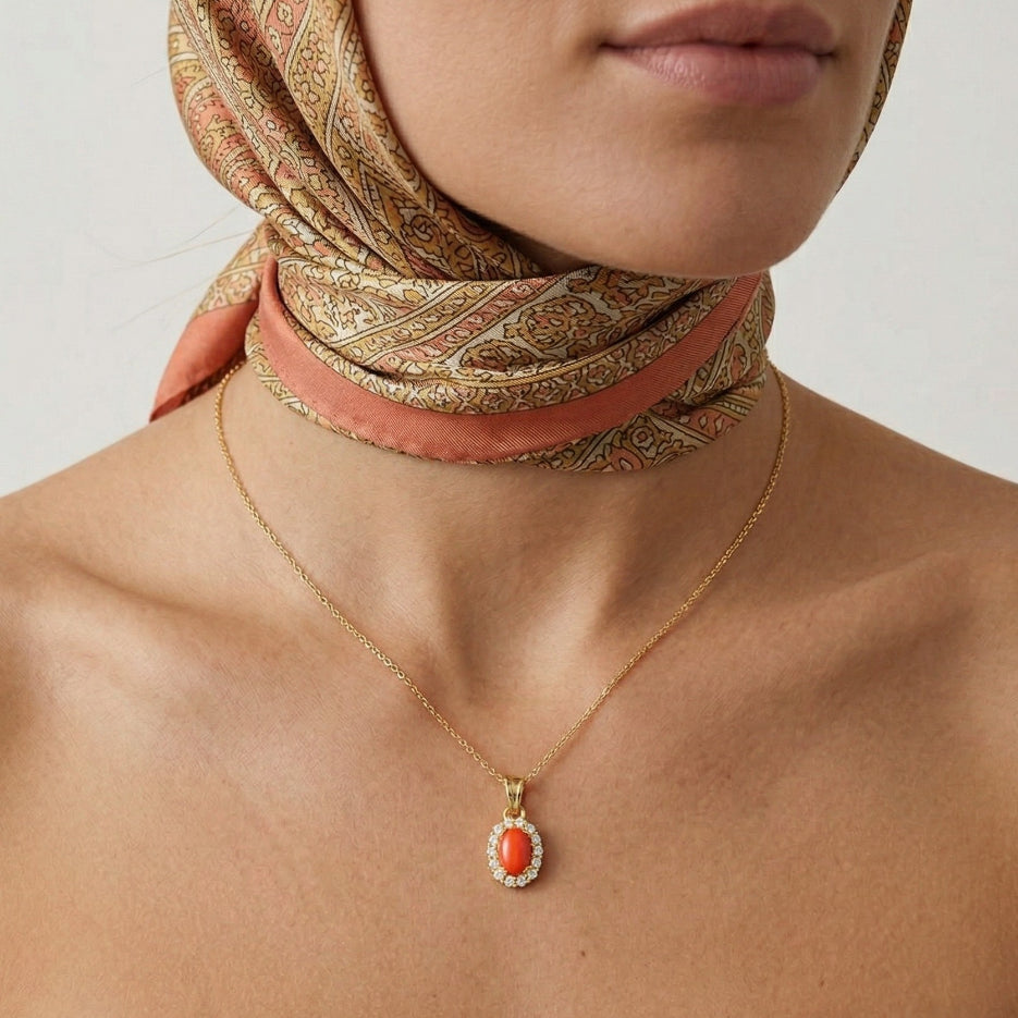 Přívěsek z 14-karátového žlutého zlata s oválně broušeným korálem ohraničeným kubickou zirkonií.